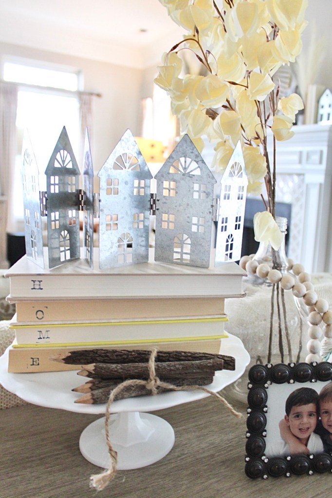 I had seen the stamped book stack and thought I’d try a few of my own. One was easy. I found some books and took a set of stamps and stamped HOME on the spine of my books. I then added the books to a cake stand and added it to my sofa table!