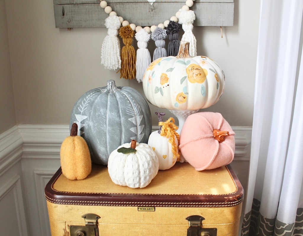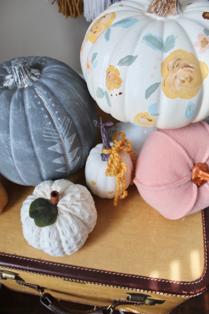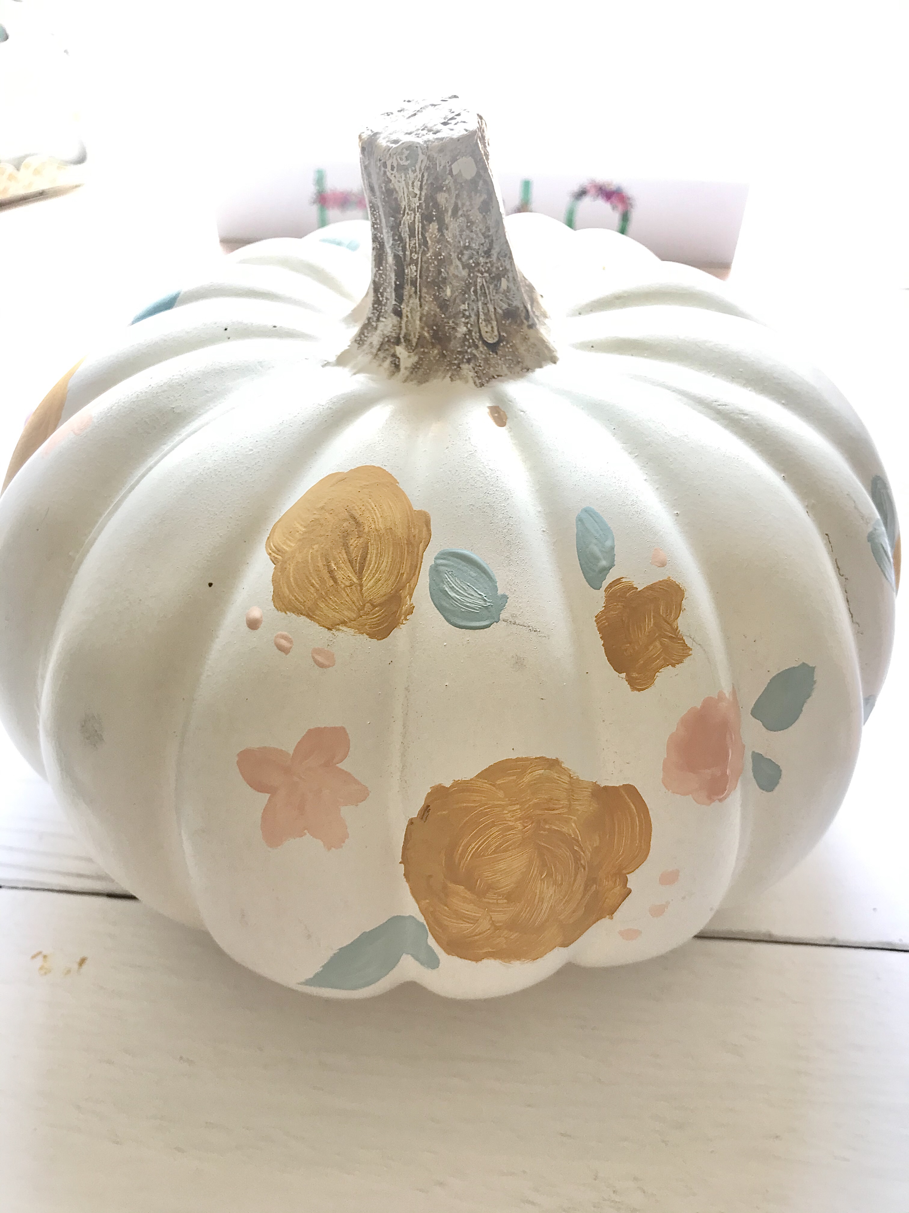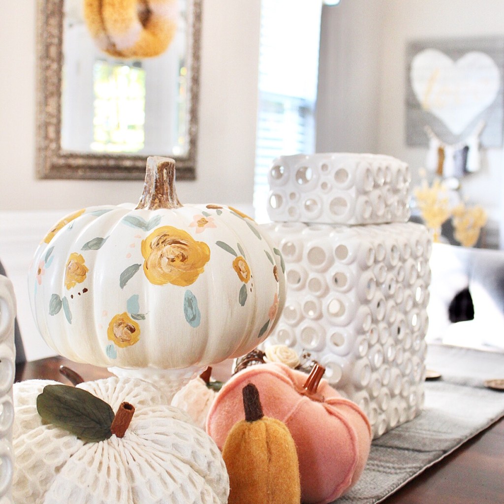 As you may have noticed, fall is my favorite. Pumpkins are part of the reason I adore fall! I love all the different types of pumpkins at the local patch, but until I can go grab some I love faux pumpkins. I love all the textures, too. I’ve done a few fun things with pumpkins over the years, but recently added a painted floral faux pumpkin to my decor. Now I think I may need to make a pumpkin patch full of floral pumpkins!