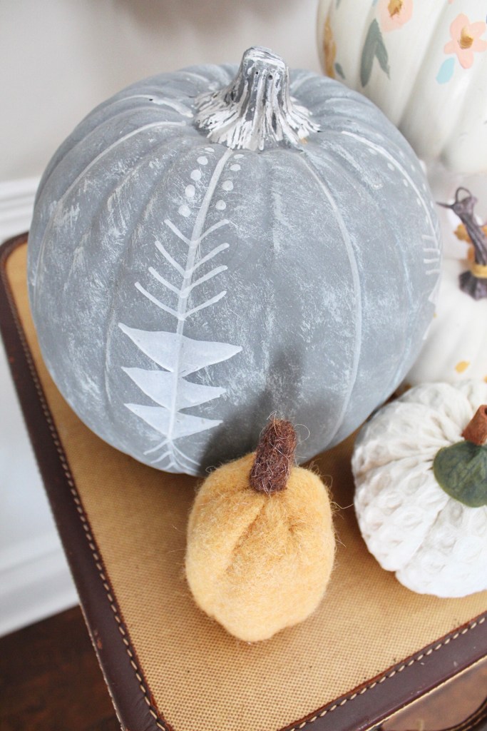 I added in a gray pumpkin to the above photo. I made that one a few years ago. The pumpkin was from Michael’s. I bought a chalk marker and did a bit of an Aztec/Geometric pattern. You could draw any pattern with the chalk marker!