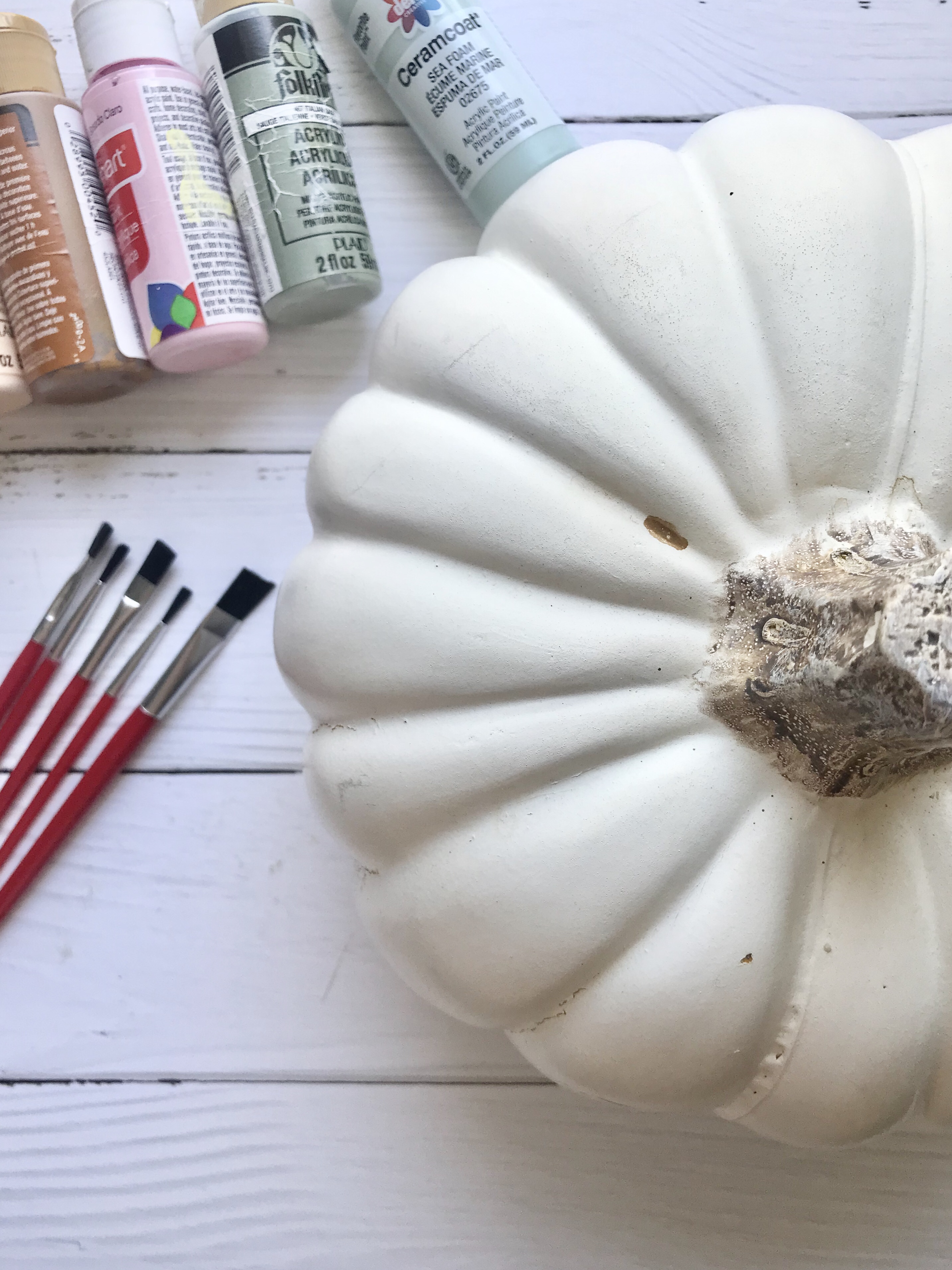 I used mustard, ochre, pale peach, mint green and a sage green. I just blended and mixed until I had a look I liked. I then put her on my dining table with some of my other pumpkins and posted a pic on Instagram. Then, I got thinking I needed to paint another one.