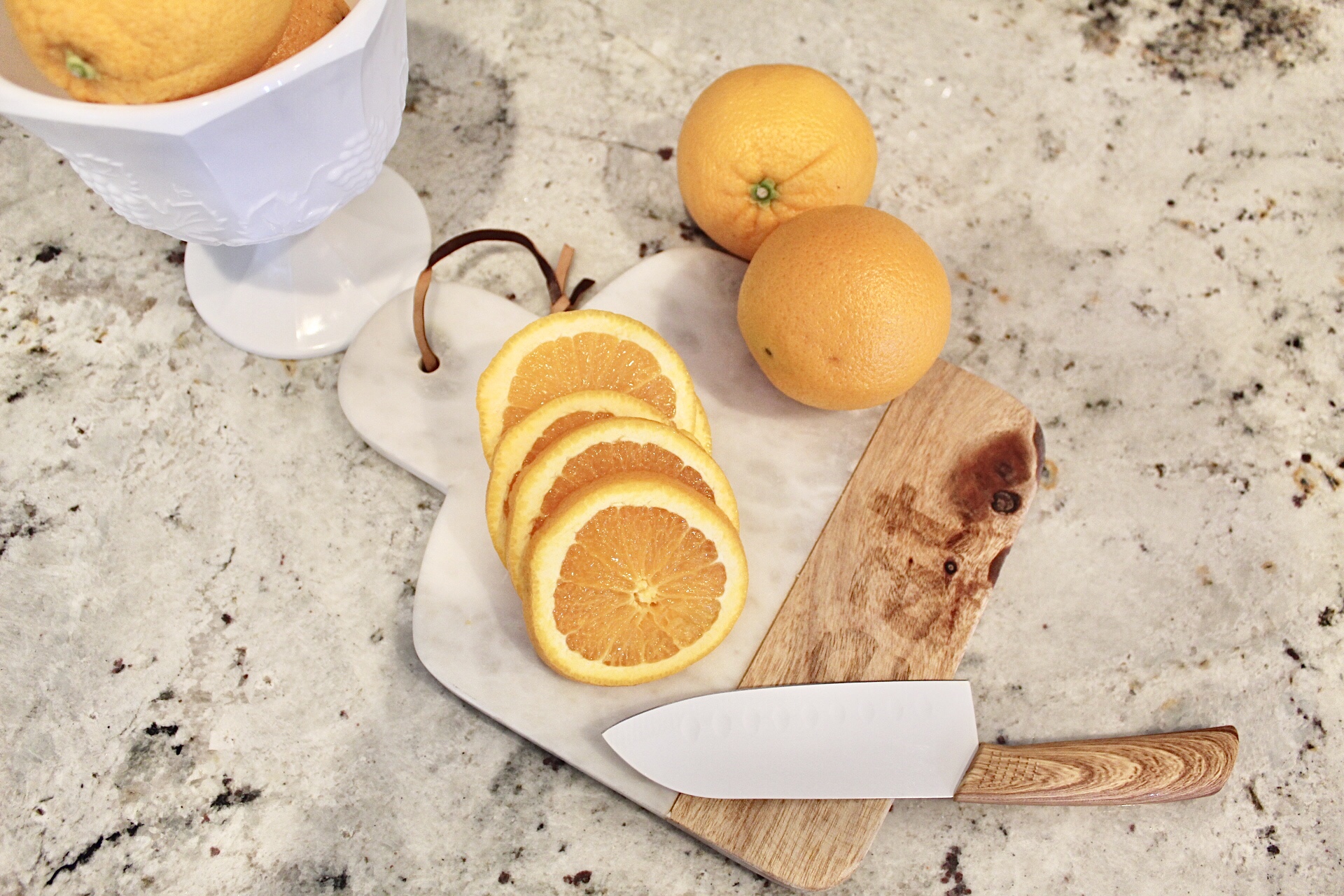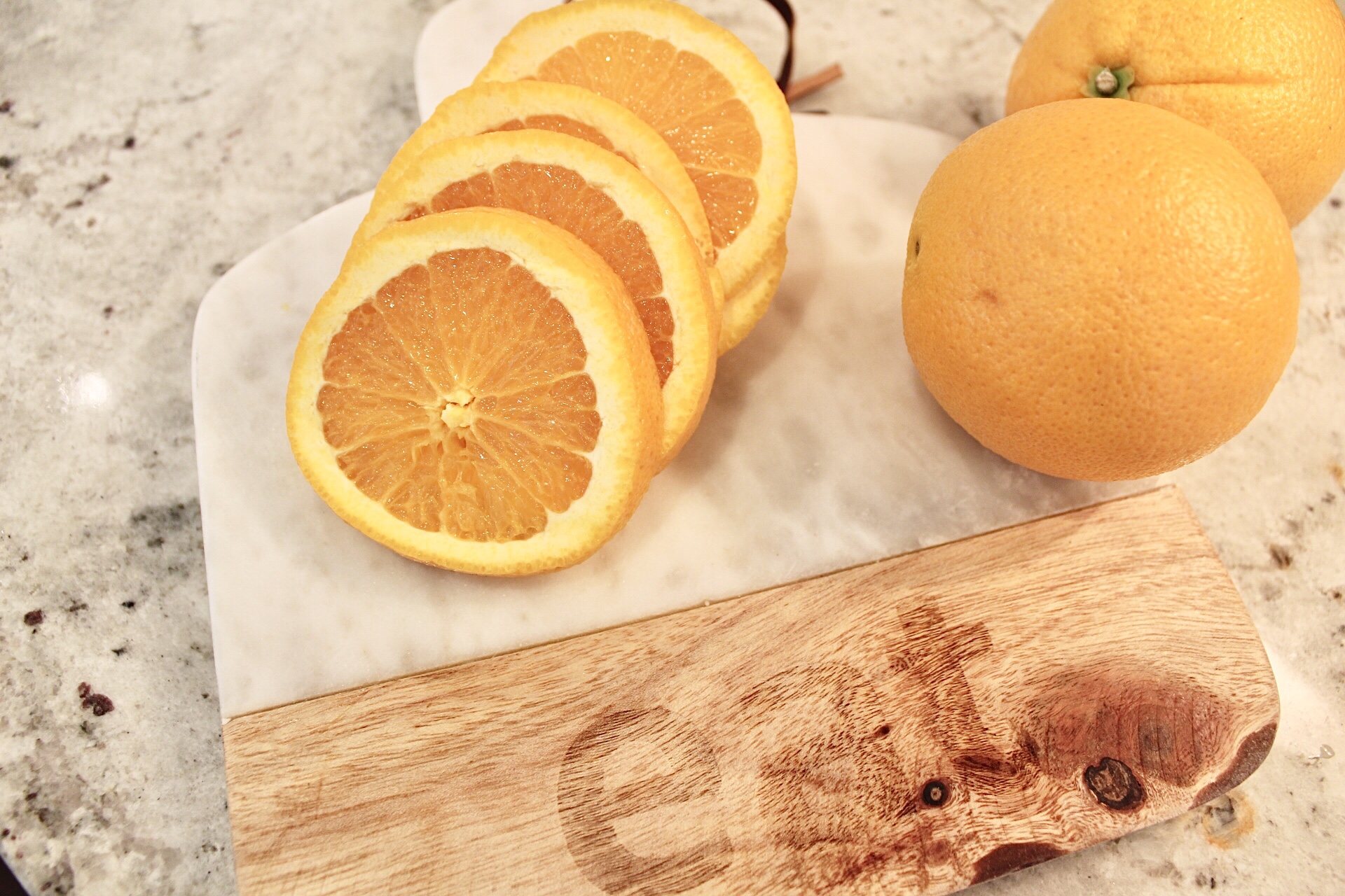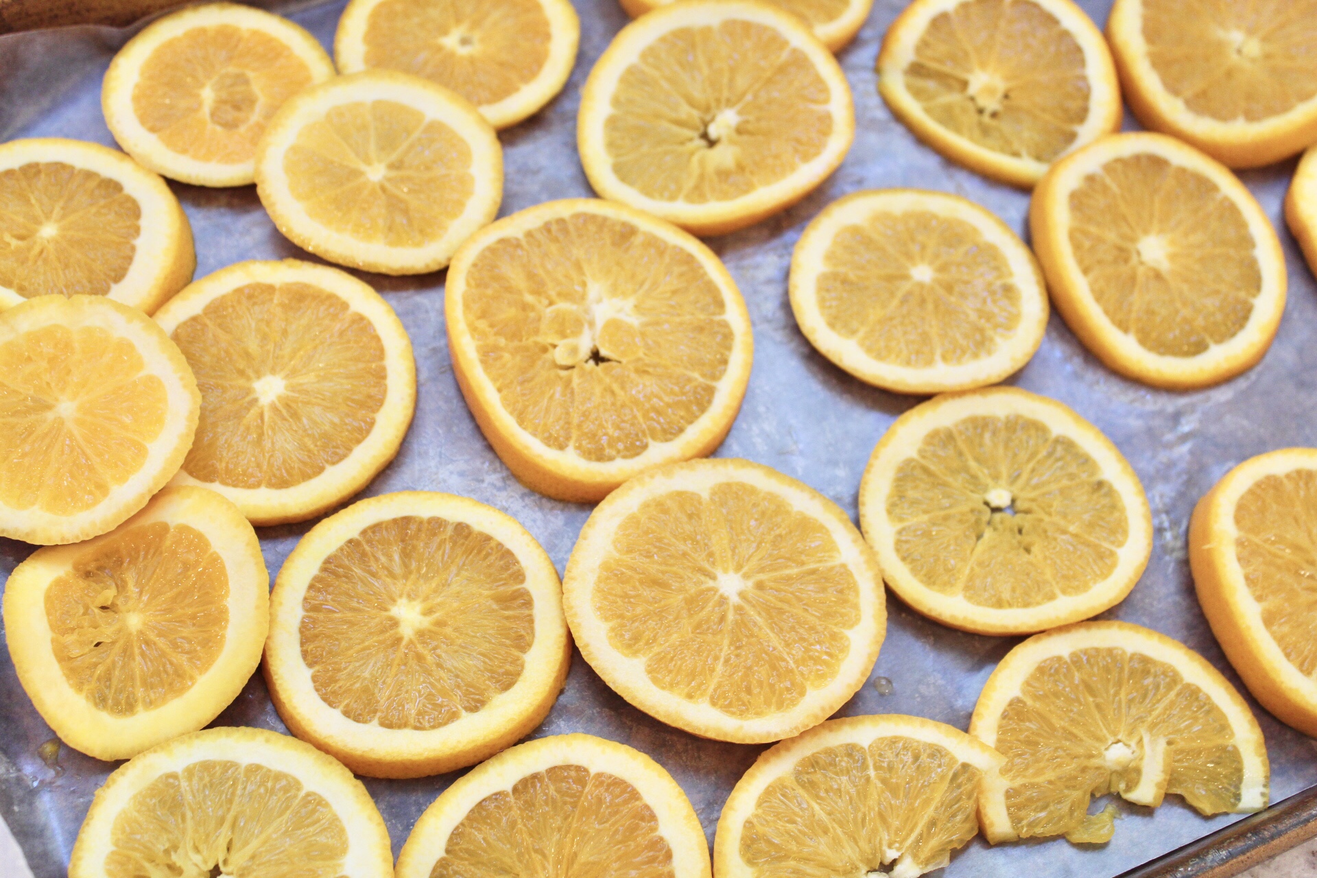 Just grab some oranges and slice them about 1/4 of an inch thick. Line a cookie sheet with parchment paper and place the oranges flat. Bake at 200 degrees for about 5 hours. Let them sit out overnight! Then have fun crafting with them!