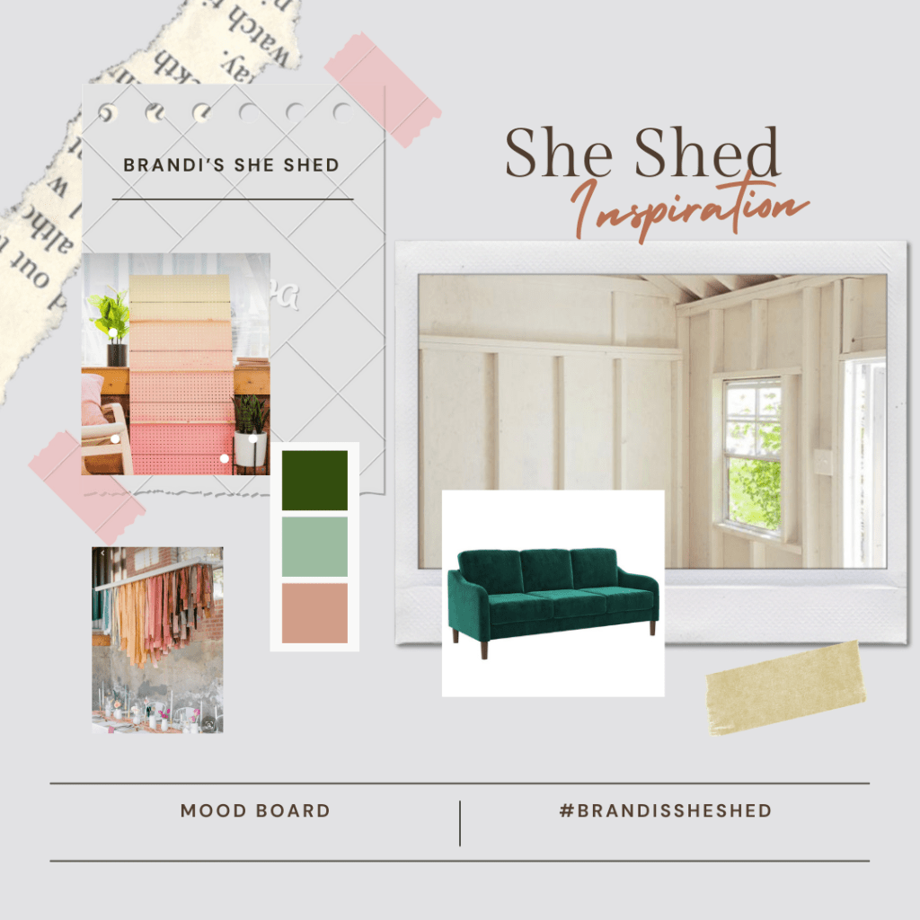 We went with a 10×14 size. I have to admit it seems so big now that the walls are up. And we still have the roof which will add four more feet. We may make some changes with the roof but we are going to think it over. In the meantime, I will be dreaming of decorating it! Let’s face it, that’s the best part! I created a mood board for a bit of inspiration.