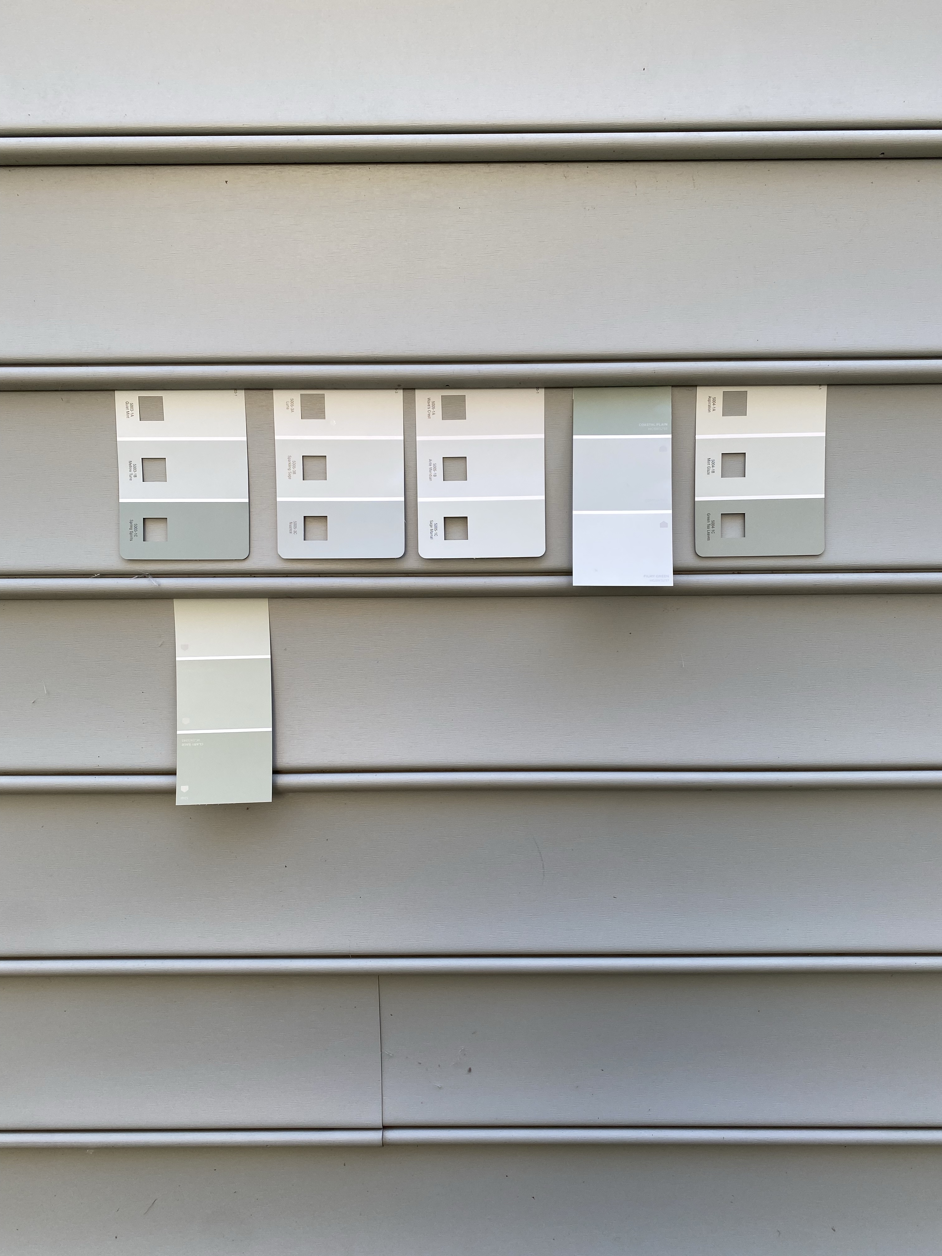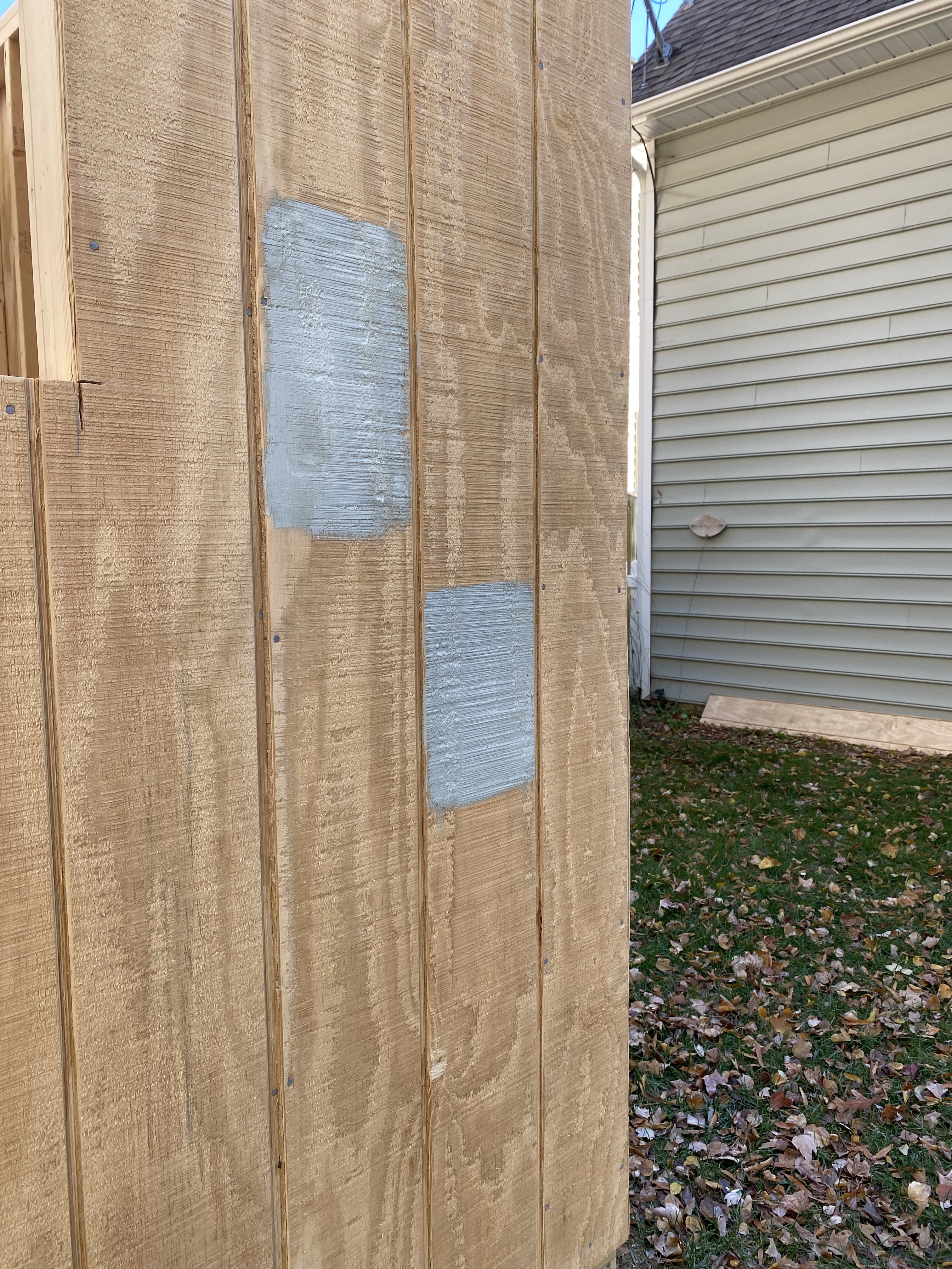 Once all the walls were up my husband told me it was a good time to paint all the siding. I wanted to match it closely to our house color. We live in a neighborhood with an HOA so we had to have all the plans approved ahead of time. We had also told them the shed would match the house. So, I grabbed some swatches and tried to decide!