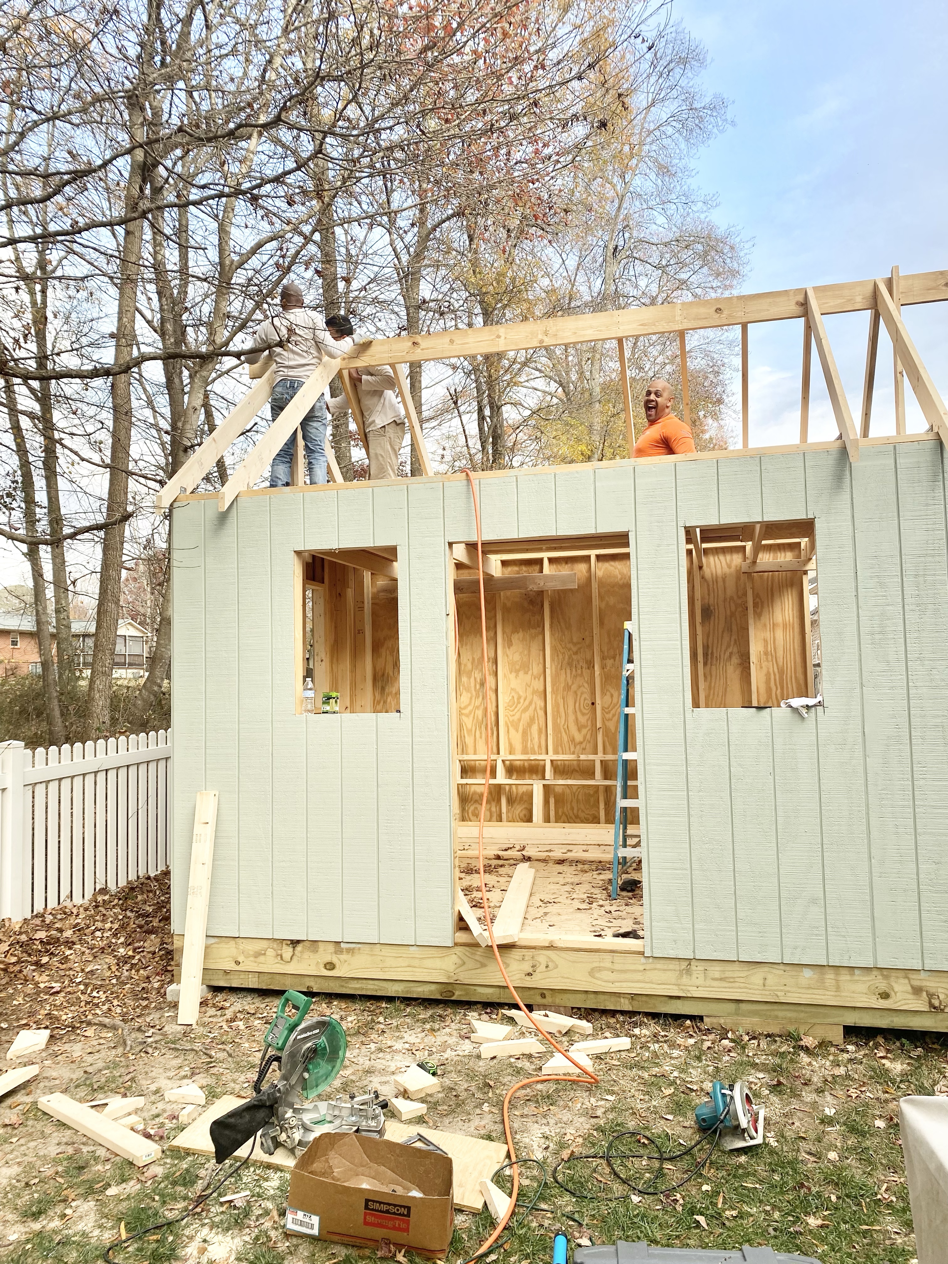 After the walls were all painted it was time for the roof. My husband warned me it would be a longer process and a bit more complicated than the walls were. So, to start the roof he has to put a tall beam across the top. Fortunately, a friend came in to help him!