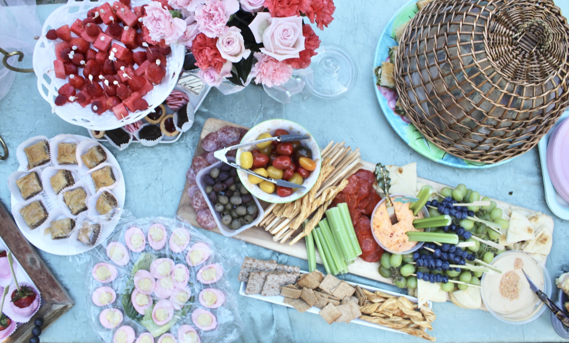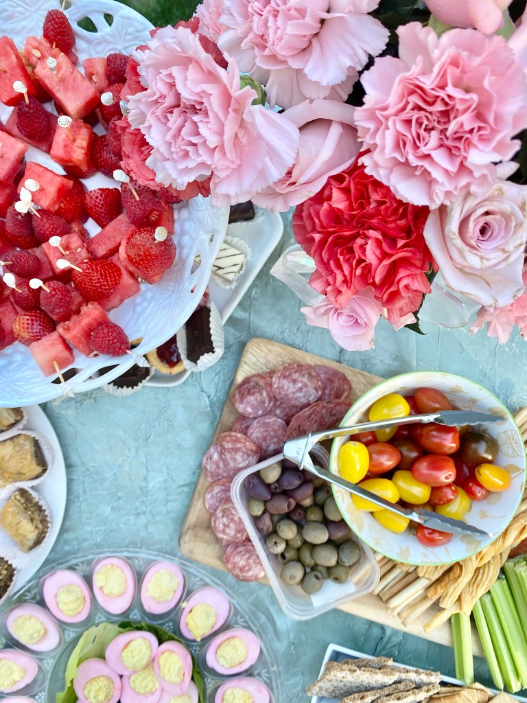 Since it was serving finger food and drinks I decided to make a Rosé sangria, pink deviled eggs, Hawaiian ham and cheese sliders, fruit skewers and desserts that were pre made from the grocery store. My mom helped and made spinach pie, a charcuterie board, baklava and more desserts.