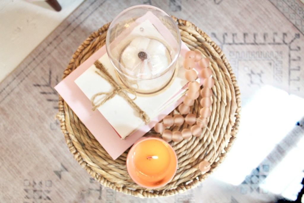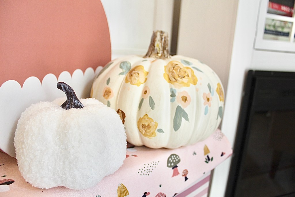 Lastly, I took out my painted pumpkin from a few years ago and added it on top of a mushroom towel from Target.