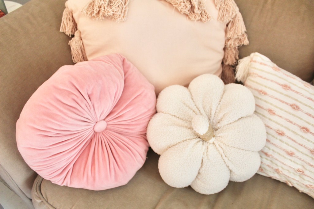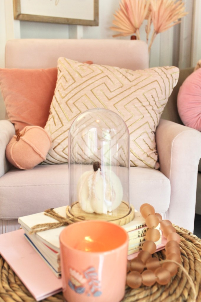 I had a cloche from Target and added a pumpkin inside. I found a cute white pumpkin pillow at Popshelf and added it on my sofa. It feels so cozy!