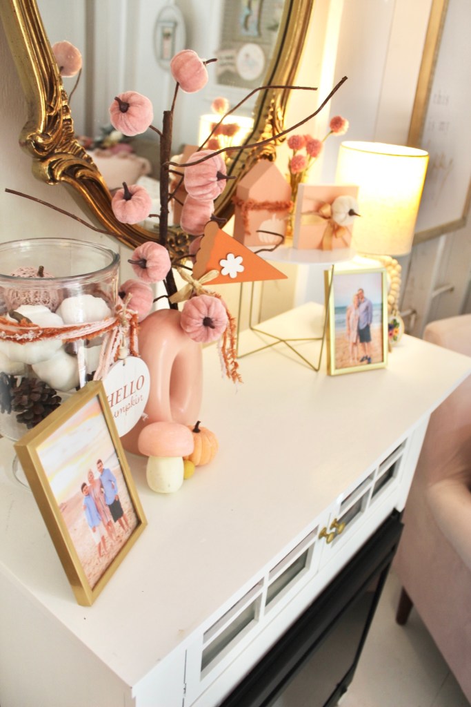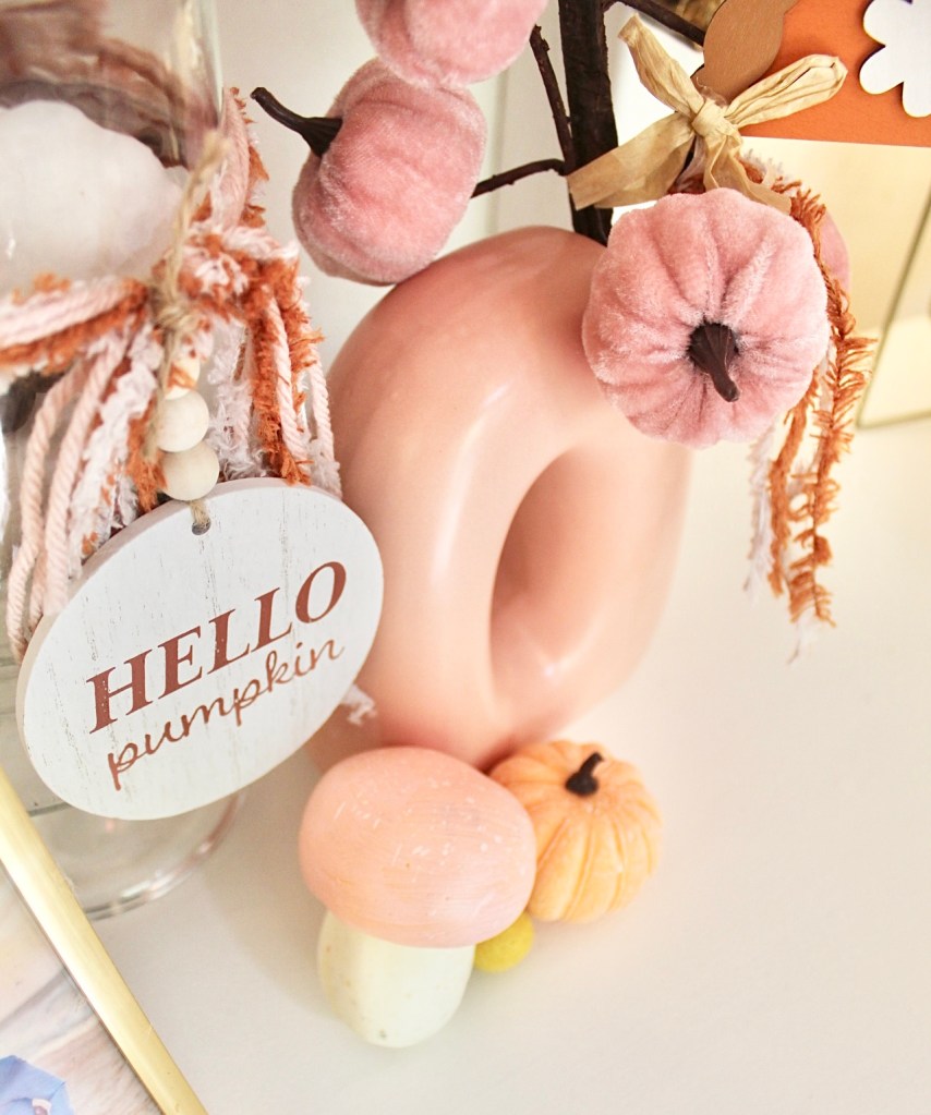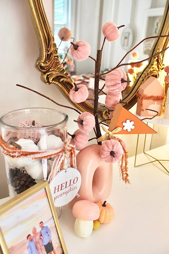 Once inside I added things I had. As you can see I have a pumpkin addiction! I added them in white, pinks and coral. The pink velvet pumpkins were from Hobby Lobby last year. The pumpkin pie pennant is from Michael’s.