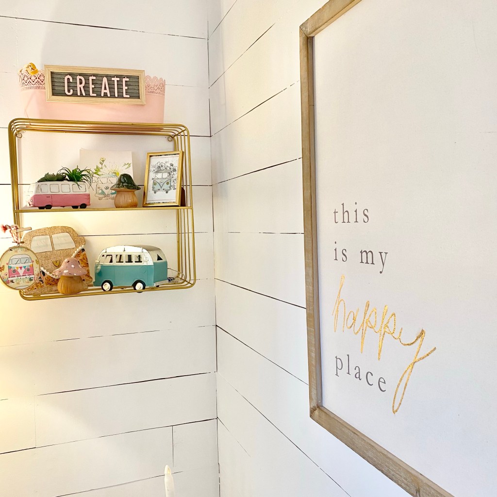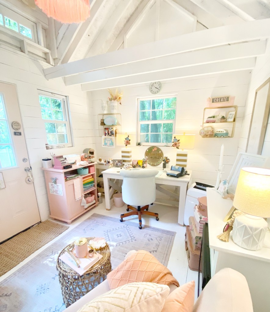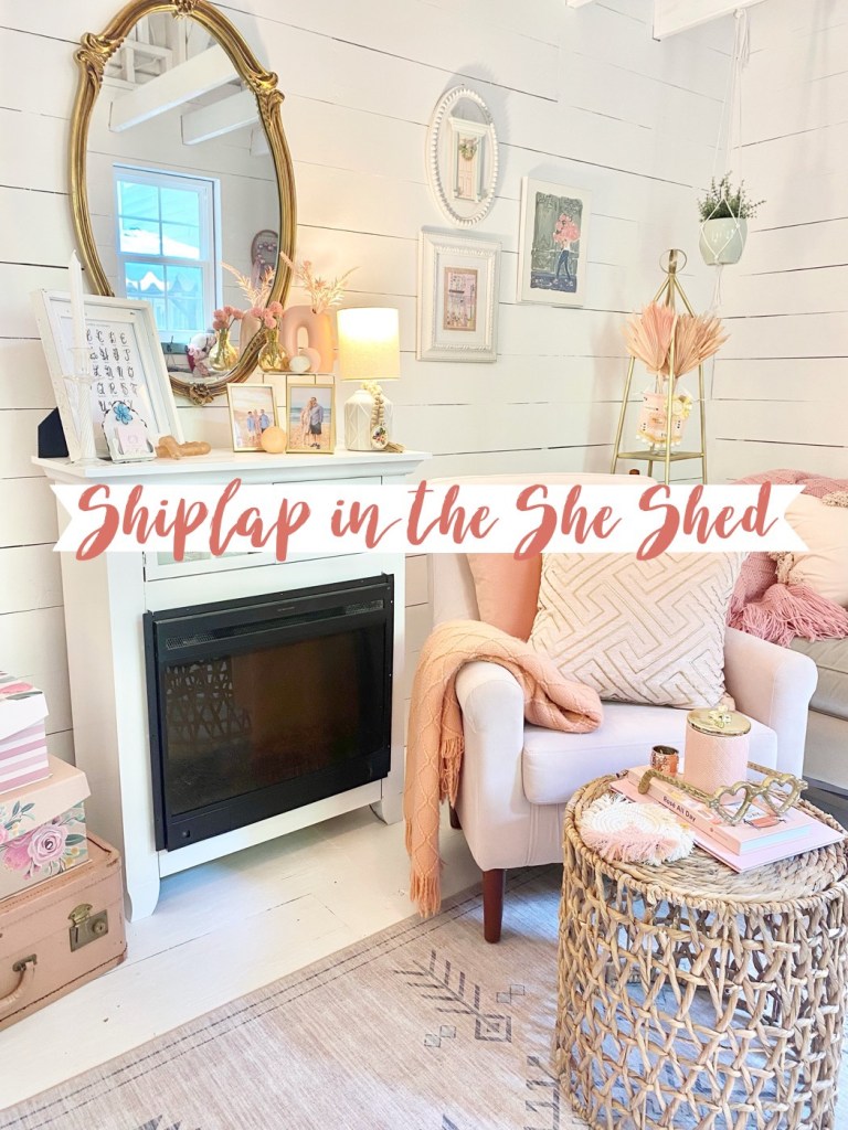 About three months ago we decided to insulate the walls of my she shed since it was getting too hot in the summer and too cold in the winter. Check out the way it looked when we started here….She Shed Tour . My husband was going to do the project and decided to cut his own shiplap. It was just more cost effective to do it this way. I’ll share some of the details and the final result!