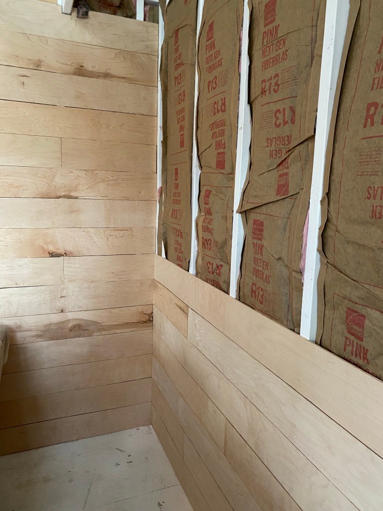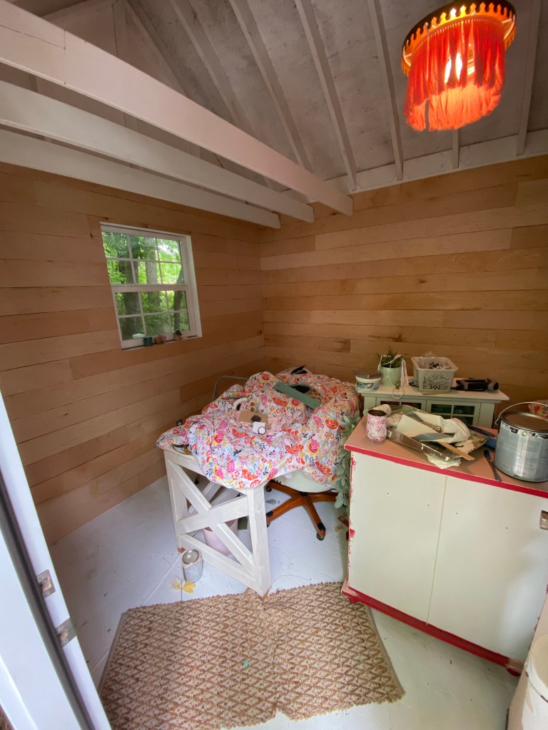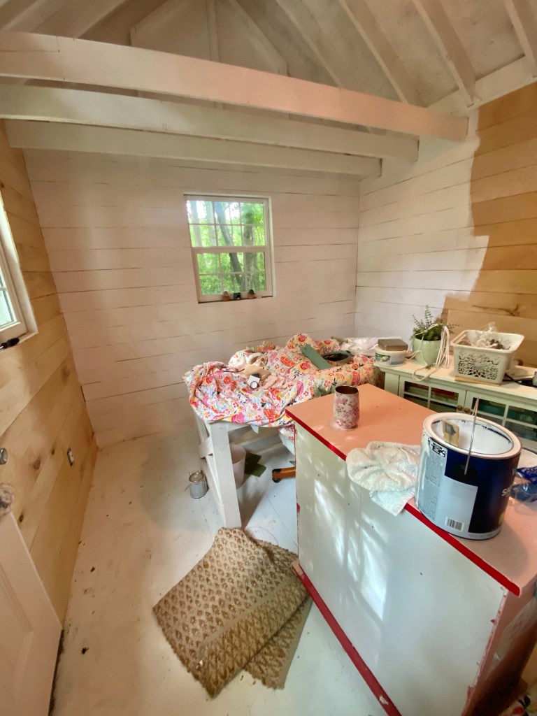 I ended up needing to roll two coats of paint. I decided not to caulk the seams. I like the rustic look and honestly didn’t want to spend all the time doing it!! Since I rolled it there is some paint in the seams (I don’t mind it, I know it may drive some people crazy!) I honestly didn’t think ahead and just rolled, if I didn’t want paint in the seams I probably would have needed to get a small roller and it would have been much more time consuming. I just wanted it to still feel like a shed and I’m so happy with it.