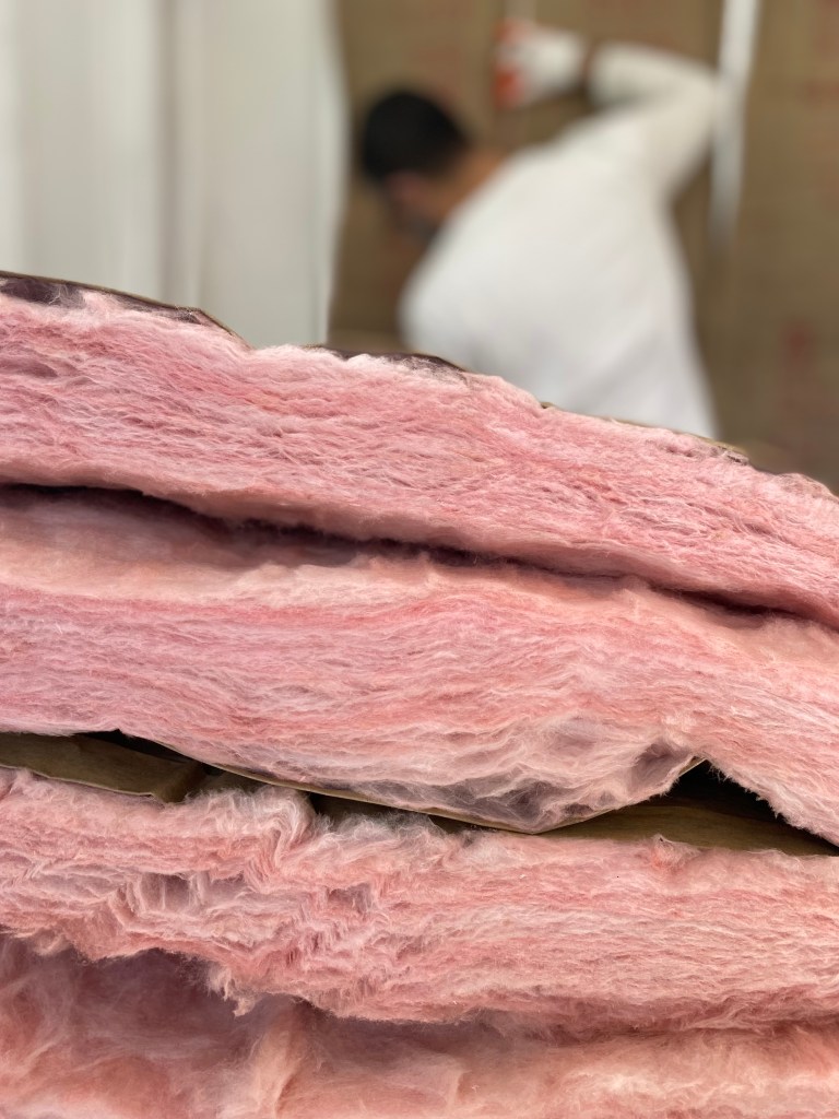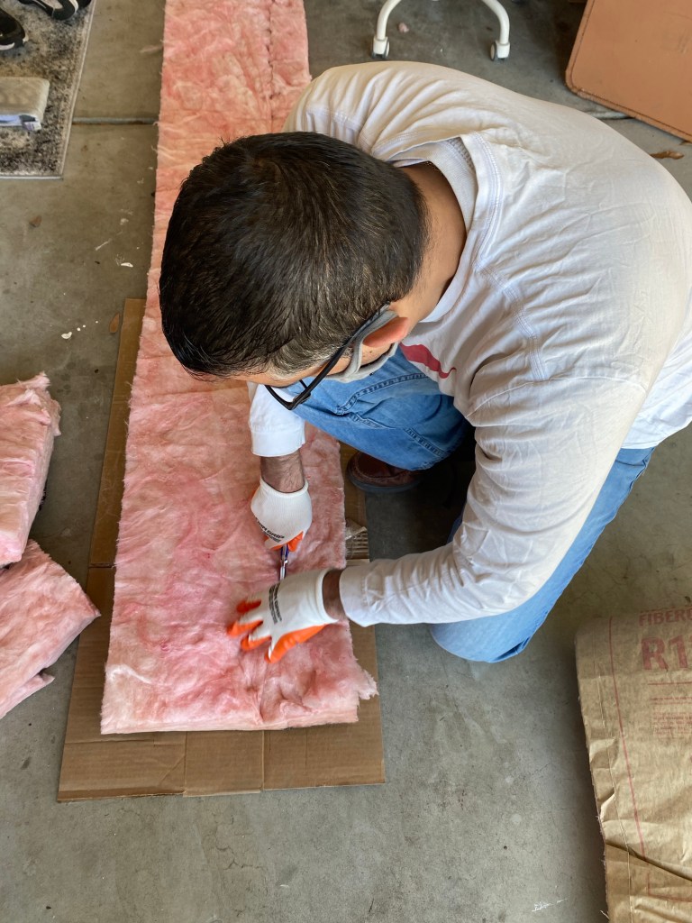 This part was fairly easy for him. He just measured and placed the insulation between the studs and stapled it in place. Of course, wear gloves, a mask and glasses!