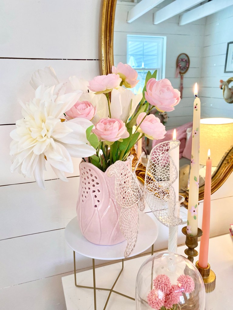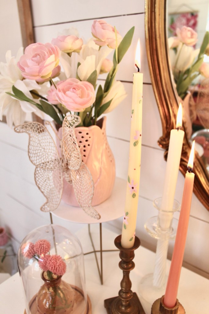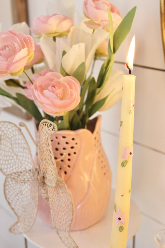 I had thrifted that pretty butterfly a few years ago and attached it to the vase. I added a few candles to my thrifted brass candlesticks. One of them I had painted. I love painting candlesticks and am thinking I will have to share a bit more about that in another post!