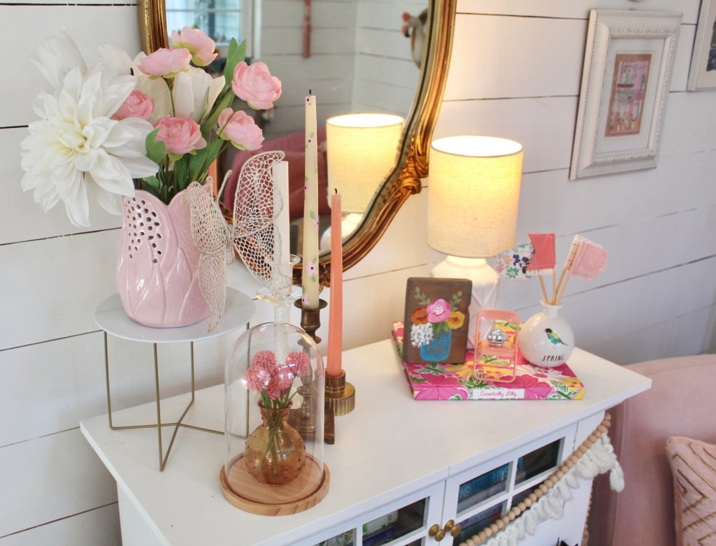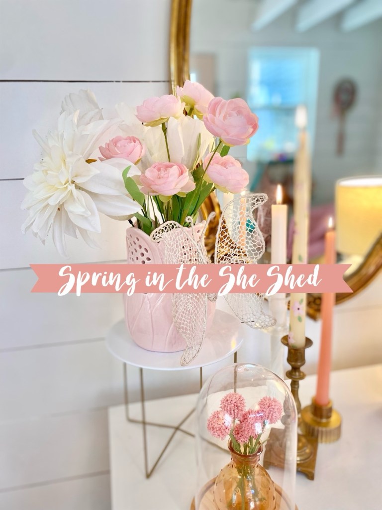 Once the temperature starts warming up I start switching over Winter decor to Spring. In North Carolina that starts happening in February. So, I was excited to make a few changes inside the she shed. I have lots of planting and some paint touch ups to do outside, but I will have to wait a bit for that.
