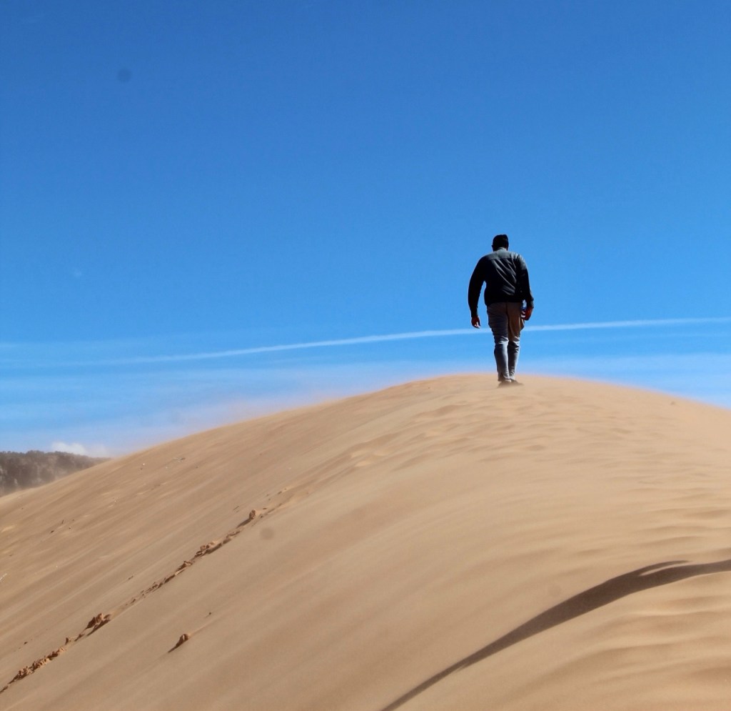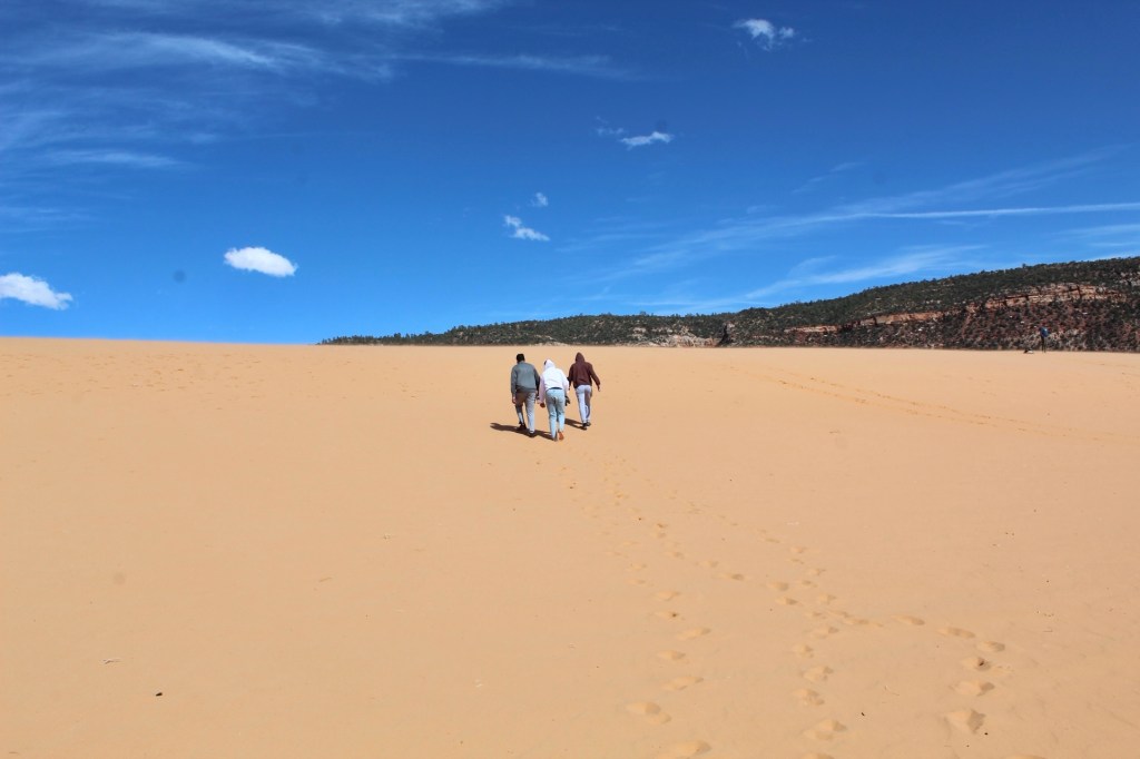 We decided the next day we’d sleep in a bit and shop around in some local shops. We also decided to go about 20 minutes out of Kanab to The Coral Pink Sand Dunes. This is a spot you can rent sled or sand boards and go down the dunes. When we arrived the Ranger told us it may be too windy to sled. And as we walked we saw a family leaving saying they wasted their money renting sleds because it was too windy. So, we decided to just walk around and hike the dunes. The wind was wild!