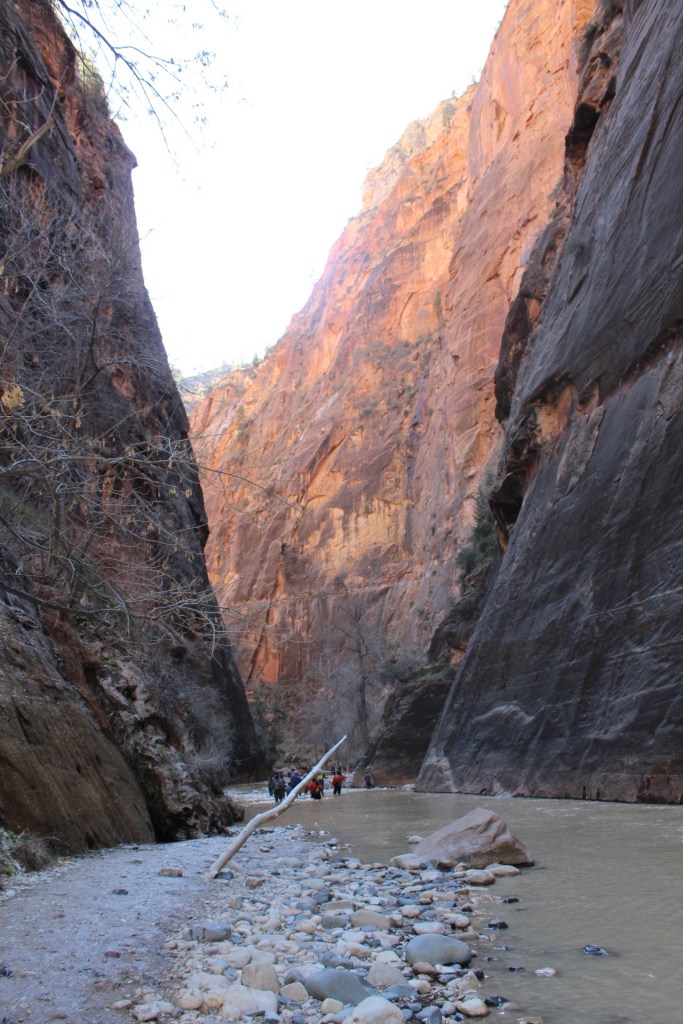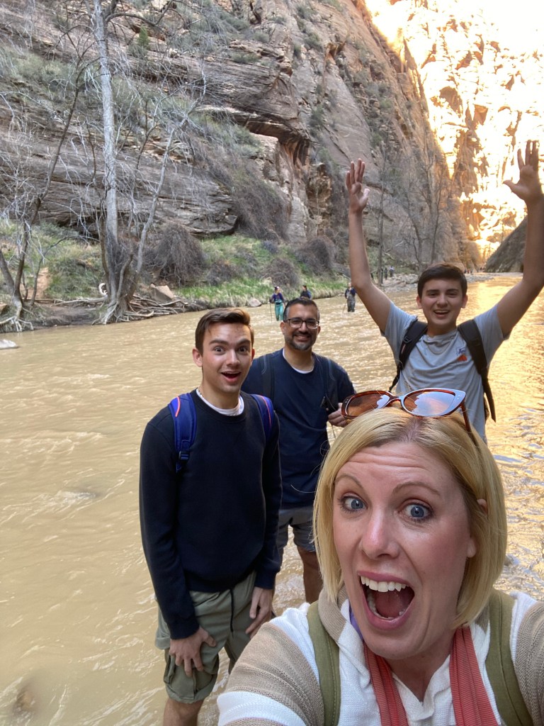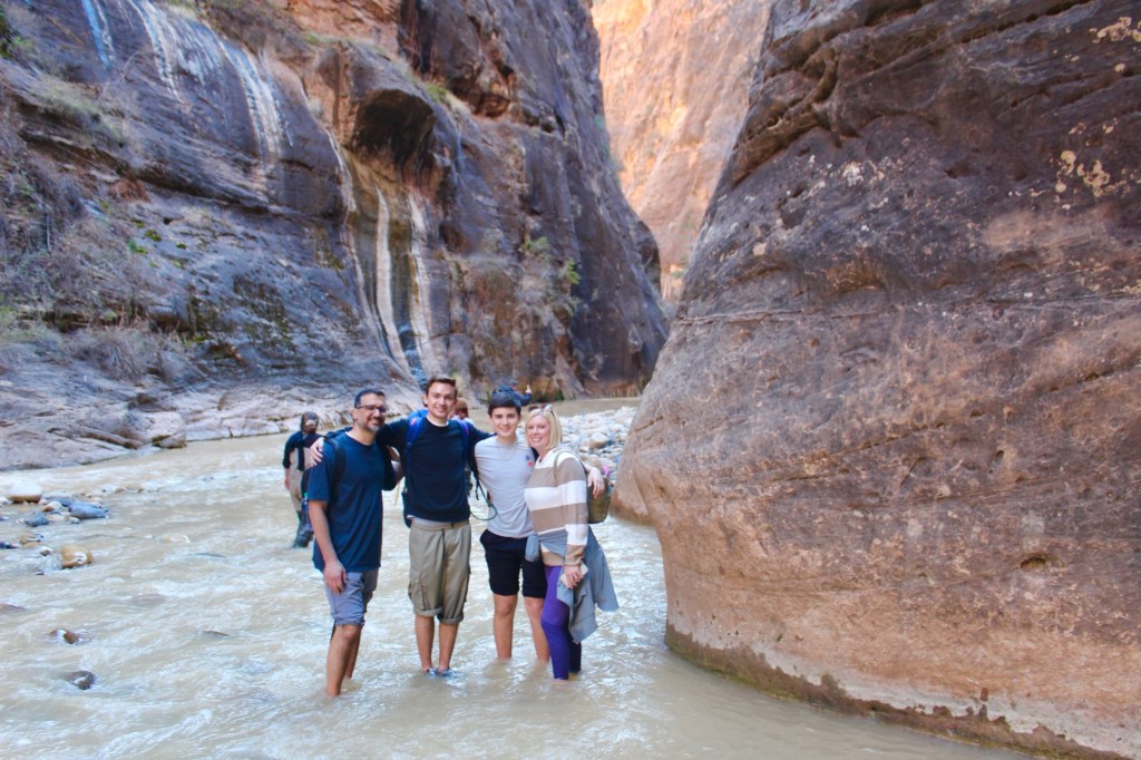 The next day was Zion National Park. The day we went was beautiful weather. Unfortunately we circled and looked for parking for two hours! It was a frustrating start to the day. I had heard Zion gets busy but I had no idea it would be that busy! Once we found parking we had to take a shuttle. Zion only allows cars to a certain point and then you have to take the shuttle. The line for the shuttle was long…we waited well over an hour. Let me just say, Zion was worth the wait! Our first stop was to hike the Narrows. This is a long hike, 8 miles. We had no intention of doing that, and once we got in the water we knew we would not last long! The water was FREEZING! I later looked it up, it was 39 degrees that day.