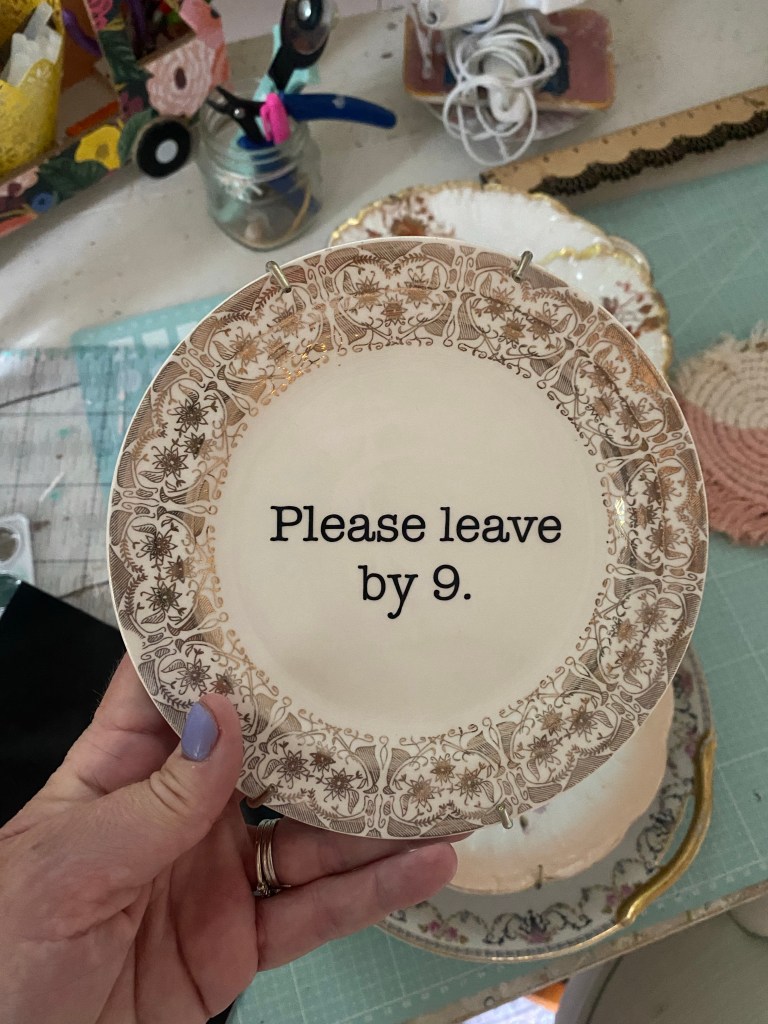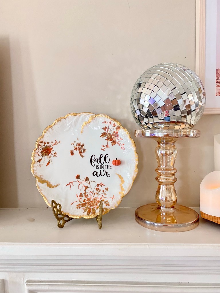 I knew I wanted to make a plate that said “Please leave by 9.” All my friends joke around that they know it’s time to go at about 9pm at my house. I also wanted a fall themed plate so I cut the vinyl on my Cricut for that and added a little pumpkin.