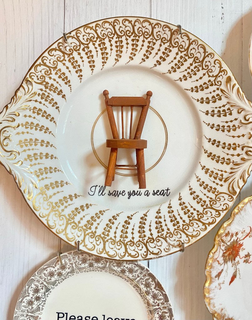 I also cut vinyl that says “ I’ll save you a seat.” I thought it would be cute with the little chair. So, I painted the chair and attached it to the plate with hot glue. I love it so much!