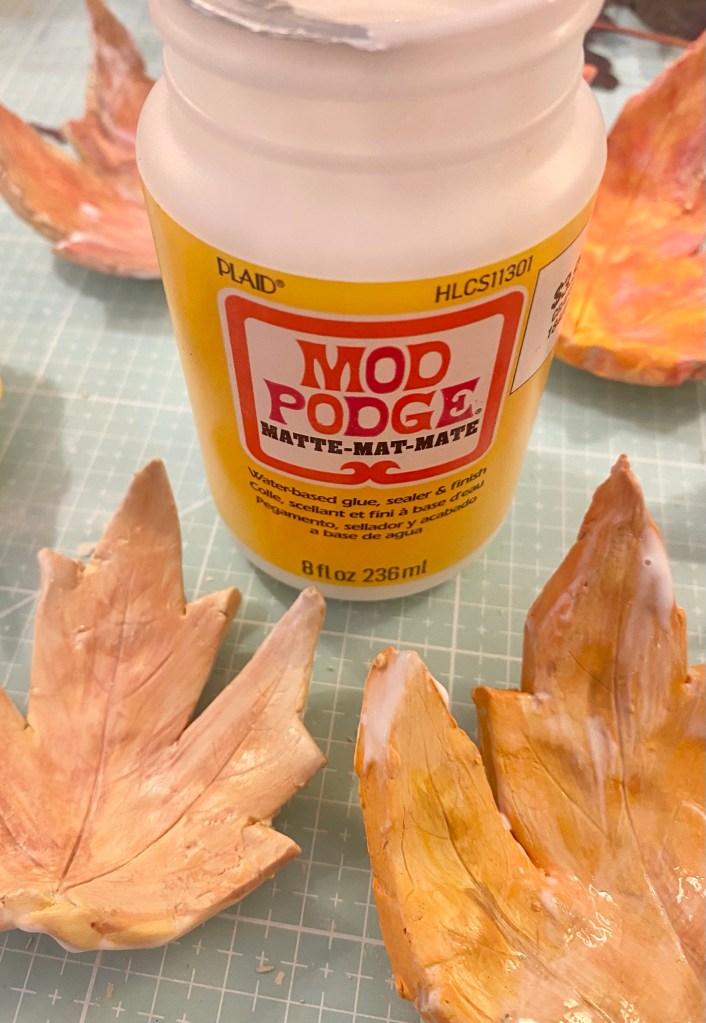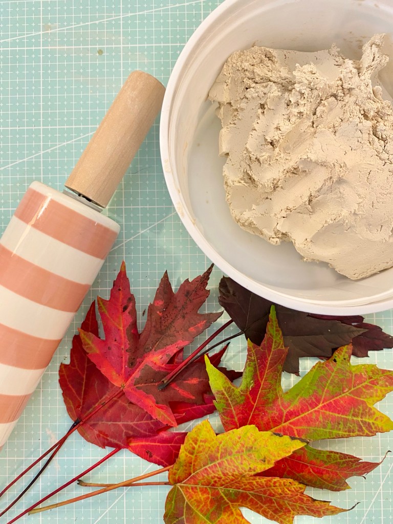 This is a very easy project. I grabbed some air dry clay awhile ago at the craft store. Then I grabbed a few leaves while I walked my dog. I did all maple leaves, but it would also be pretty with different types of leaves. Then I grabbed my rolling pin.
