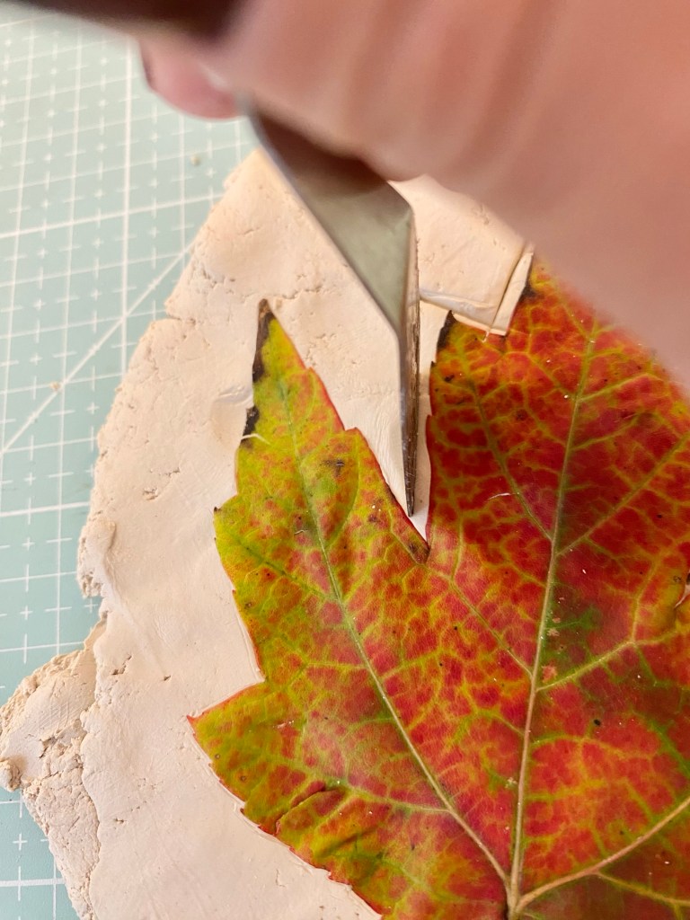 First off you want to take some clay and roll it out. You can even stretch it and flatten it without a rolling pin. Next, place a leaf on the clay and press it into it. You want to see the texture of the leaf in the clay. Then you peel off the leaf and take a knife or sharp edge and trace along the leaf. lastly, place your clay leaf in a bowl or glass so it will take on more of a bowl shape. Let them dry overnight to harden.