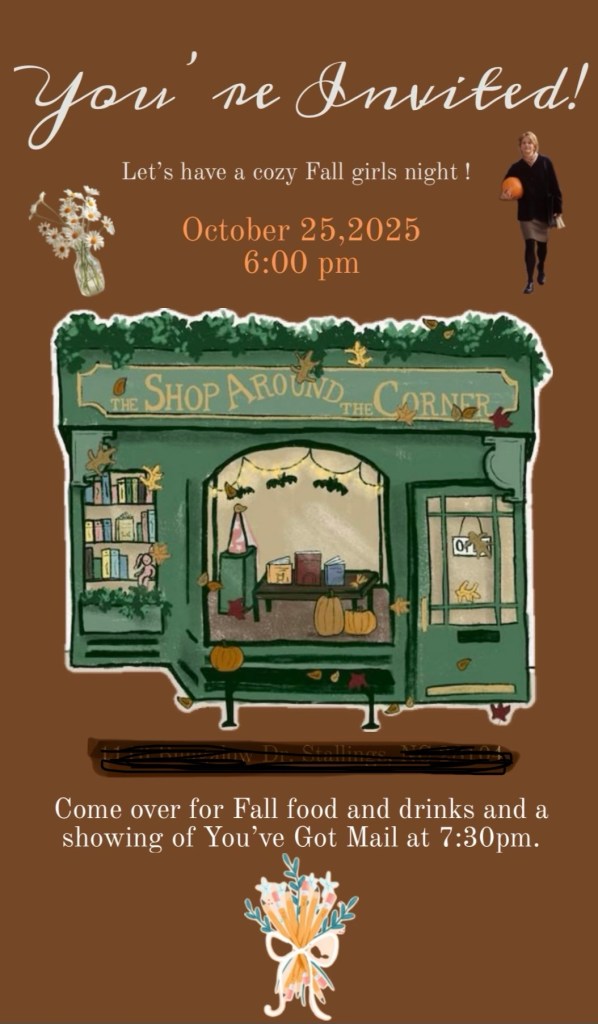 If you know me, you know I love a theme party. And I love Fall. So, what better way to combine one of the best Fall movies and some girlfriends then to host a You’ve Got Mail Fall Party?!??
