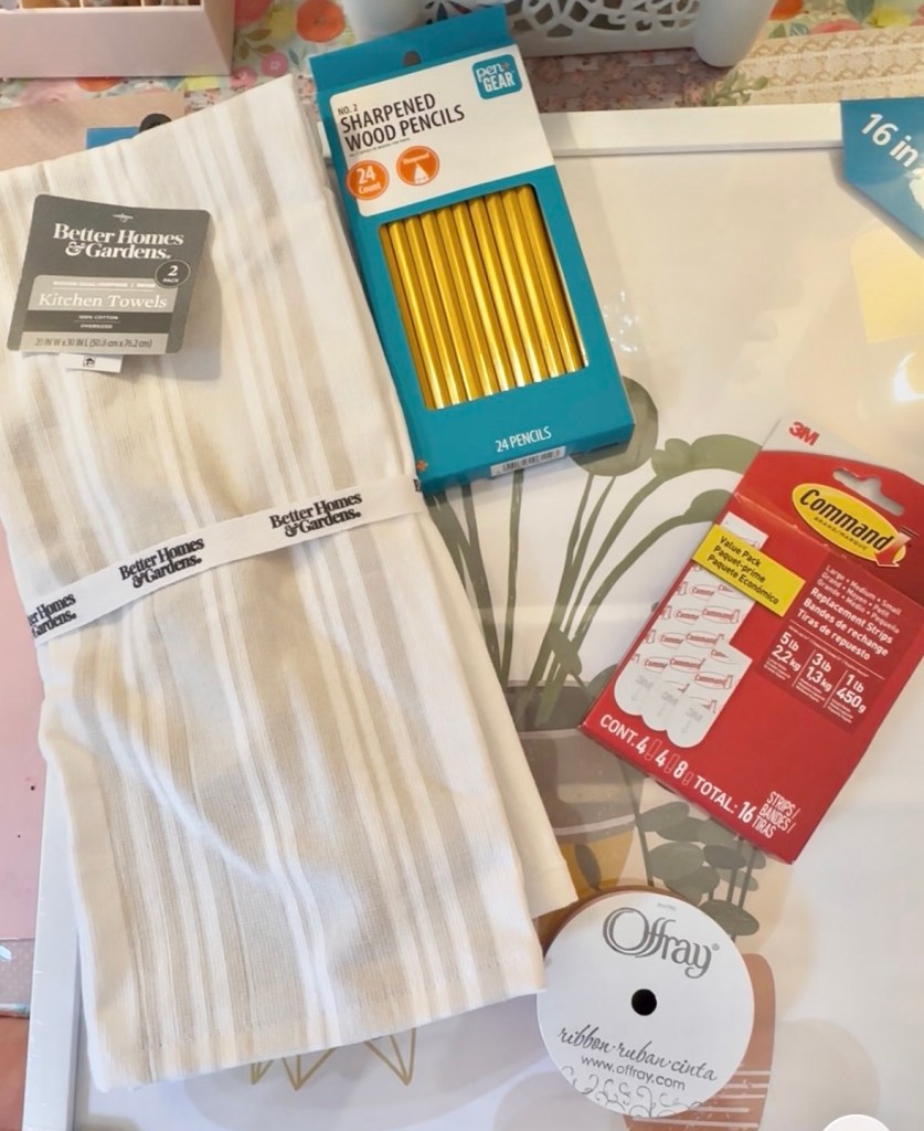 While I was painting the house I was thinking of cute quotes from the movie, too. So, I added a “bouquet of sharpened pencils” to the little vignette but got thinking about making a piece of art, too. So, I grabbed some more pencils, a frame at Walmart and a washcloth. I put the washcloth in the frame, cut out the quote from the movie on my Cricut in vinyl and added a bouquet of pencils! I had to cut the pencils in half, glue them to a piece of cardboard and tie the ribbon around them. I then used a command hook to hang them on the outside of the frame! Now it’s a piece of art I am keeping up all year.