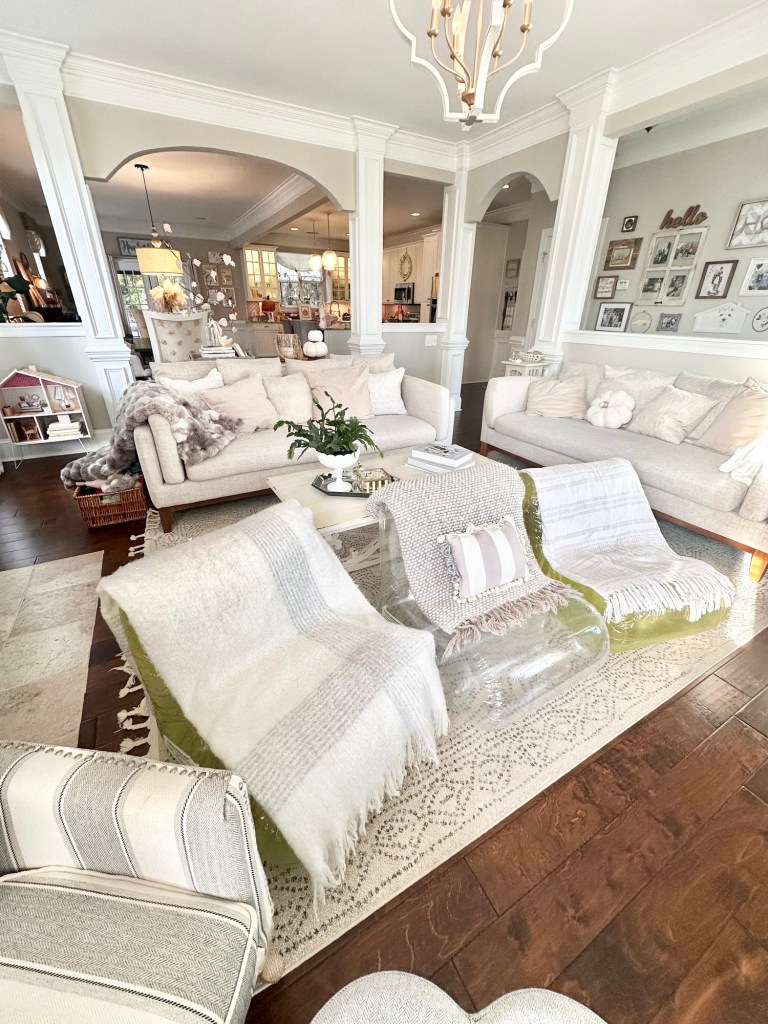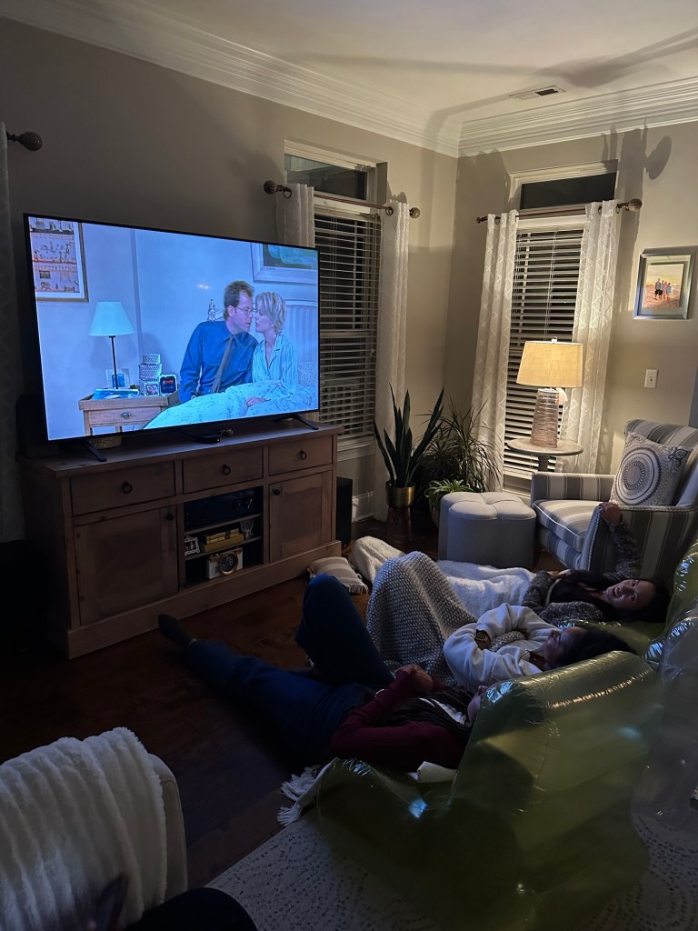 Since I was having 12 of us over I needed more seating. I had bought some inflatable chairs and added blankets. Honestly they weren’t that great and deflated quickly so I would not recommend them. We squeezed in on my couches and I brought some chairs from my dining room in and it all worked out.