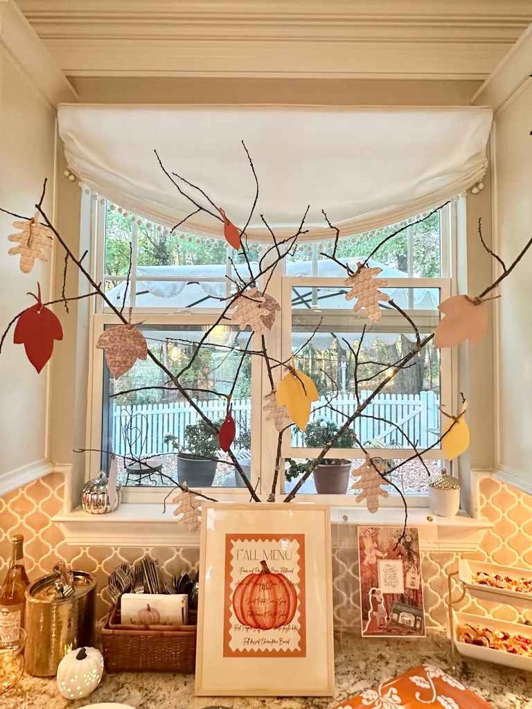 I did one more craft. I grabbed a huge tree branch from my yard and cut out leaf shapes on my Cricut machine and attached them with twine. This is such a cheap and easy idea but adds so much impact!