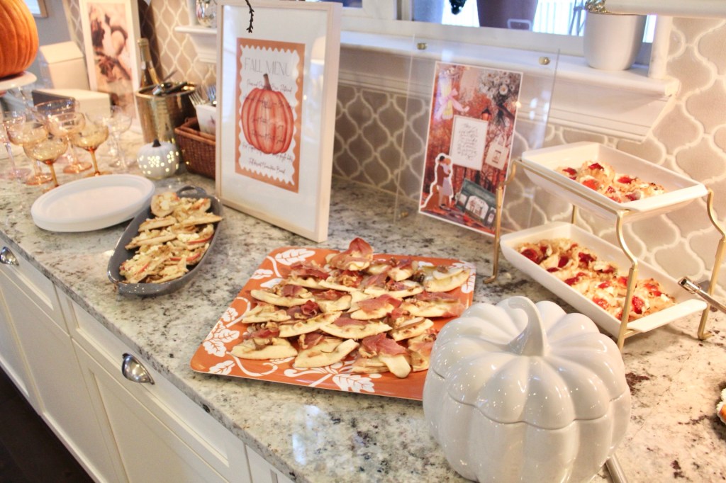 I had a clear frame that I wanted to add some images to for the food table. So, once again I made a Pinterest collage and had it printed at Staples. I also created a menu on Canva and framed that. I like the custom touches that make the party feel a bit more “fancy.” A friend came over and also helped me make pumpkin favors for the guests. We just tied some yarn to mini pumpkins for a sweet gift.