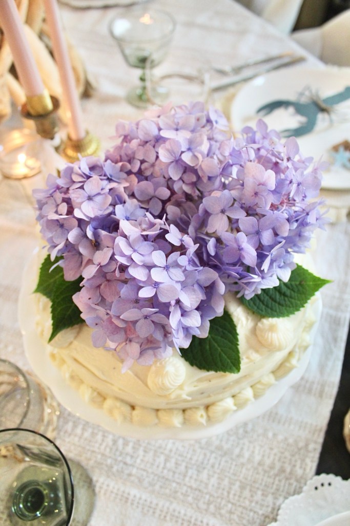 I’m not a fancy baker so I just made a quick and easy cake and topped it with hydrangeas from my yard. I put the stems of the flowers in a straw so the flowers would stand up on the cake.