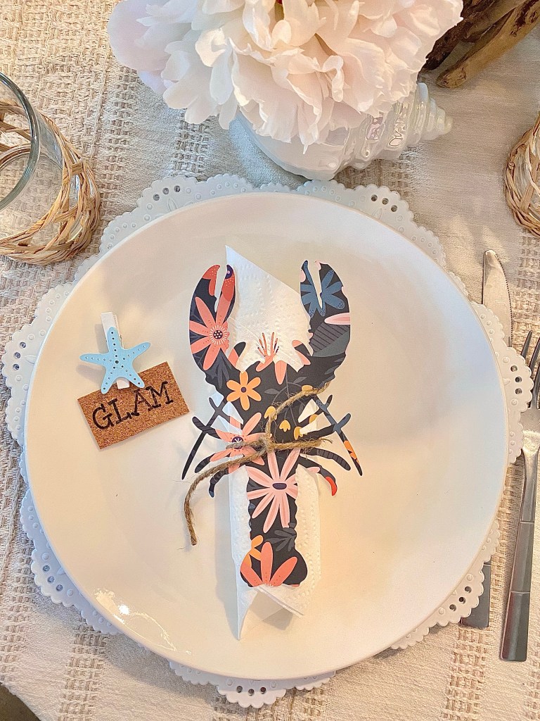 Next up I had made some paper lobster napkin holders on my Cricut machine. I had lots of blue scrapbook papers and used a mix. I then tied some twine around the lobster and napkin . I think it’s such a fun touch! I also found the little starfish clips at Dollar Tree and made name tags on cork board with a stamp.