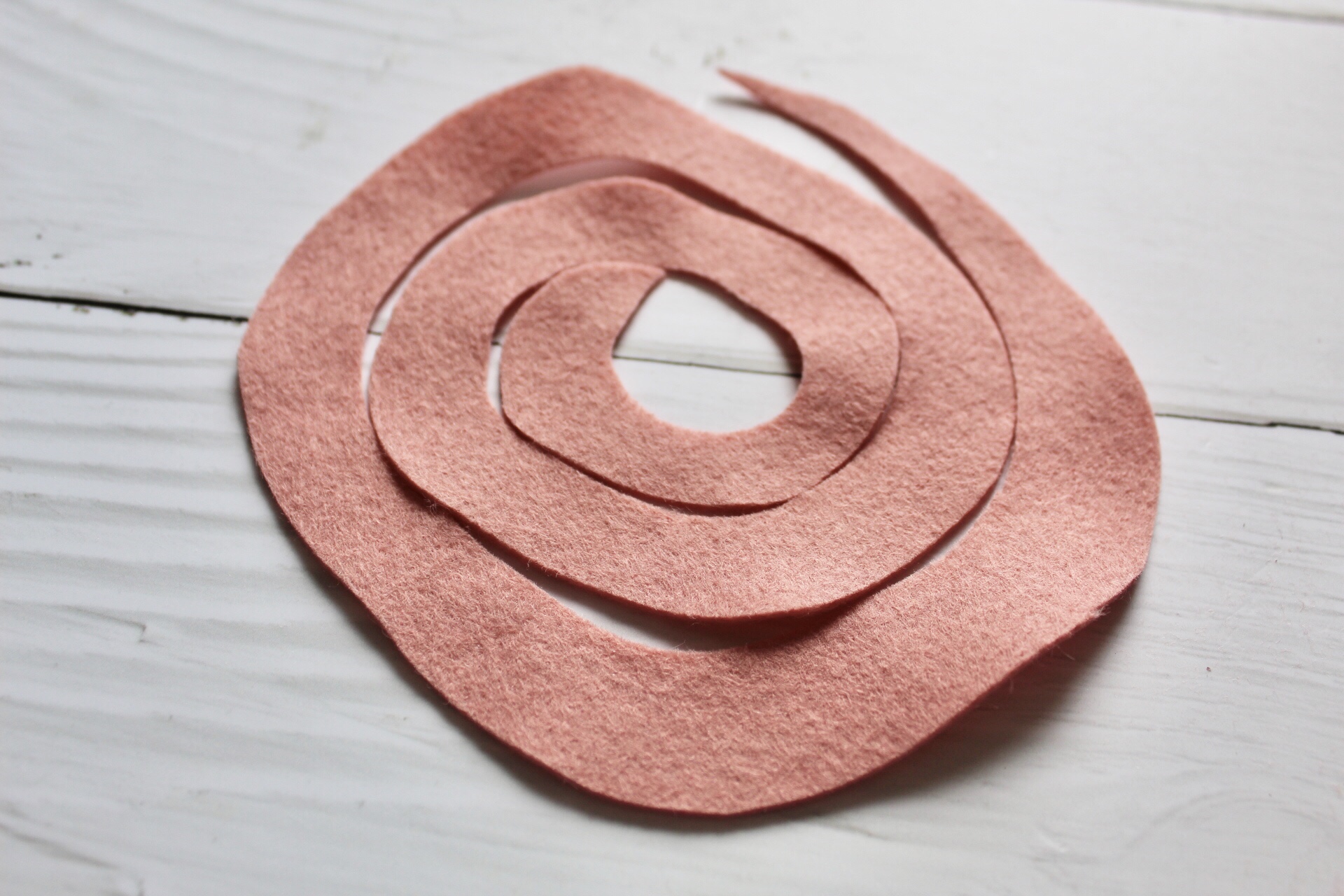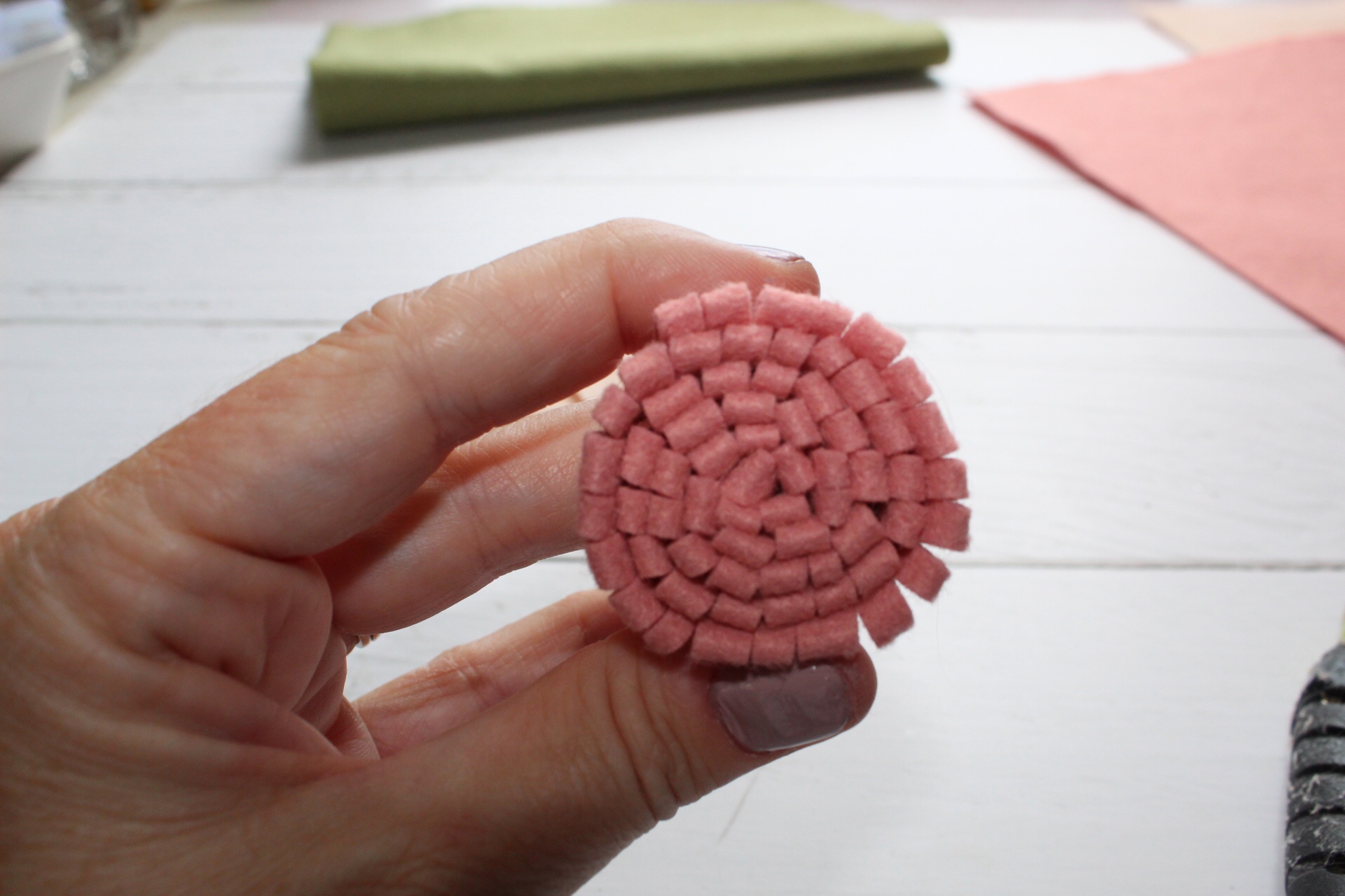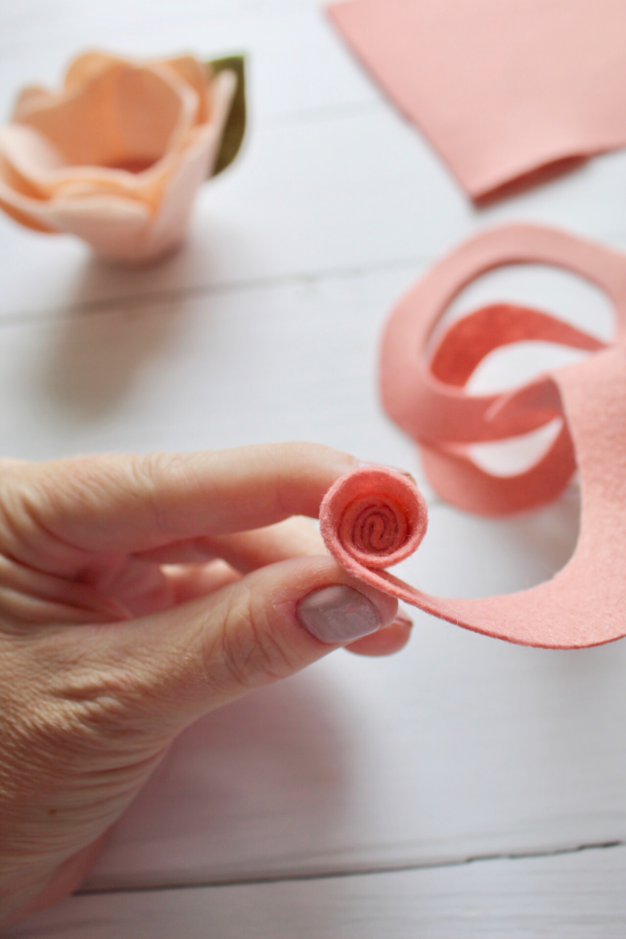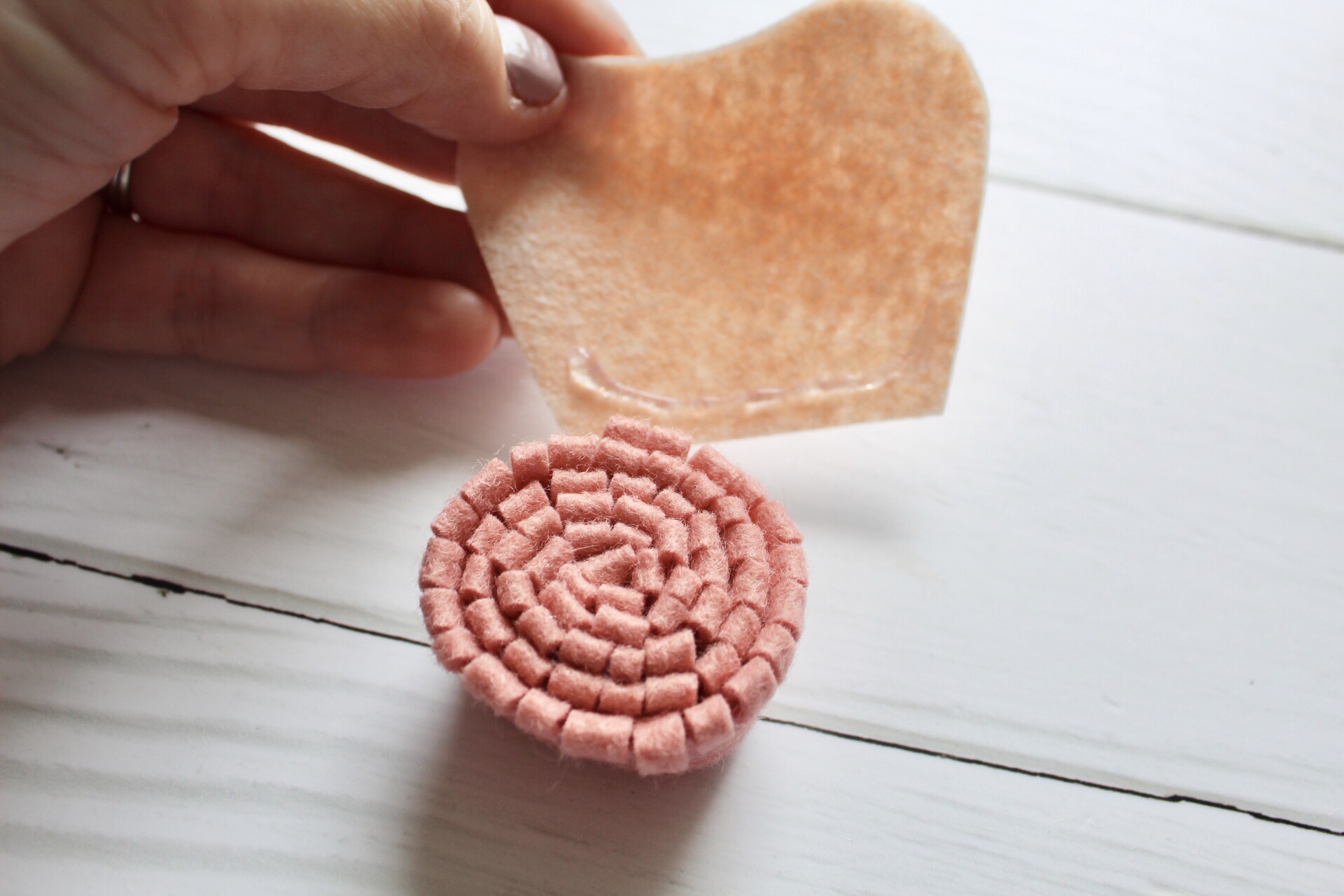 From your skinny corner you will start to roll the felt. First add a dot of glue and then roll. Every inch or so add a bit of glue and continue rolling until you come to the end. Tuck the last bit underneath and glue. Add a felt leaf.