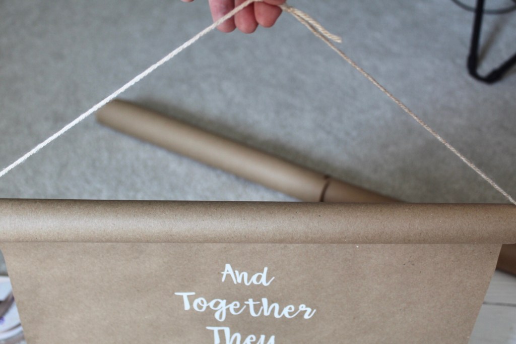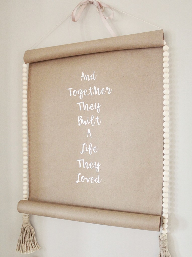 Then I flipped it back around. I rolled the top and bottom, which the paper naturally did from being rolled on the tube. I paper clipped in each of the corners to hold the scroll in place. I picked a quote and cut my vinyl on my Cricut machine. If you don’t have that option you can find vinyl decals in most craft stores or on Etsy! I then transferred the vinyl onto the paper with transfer tape.